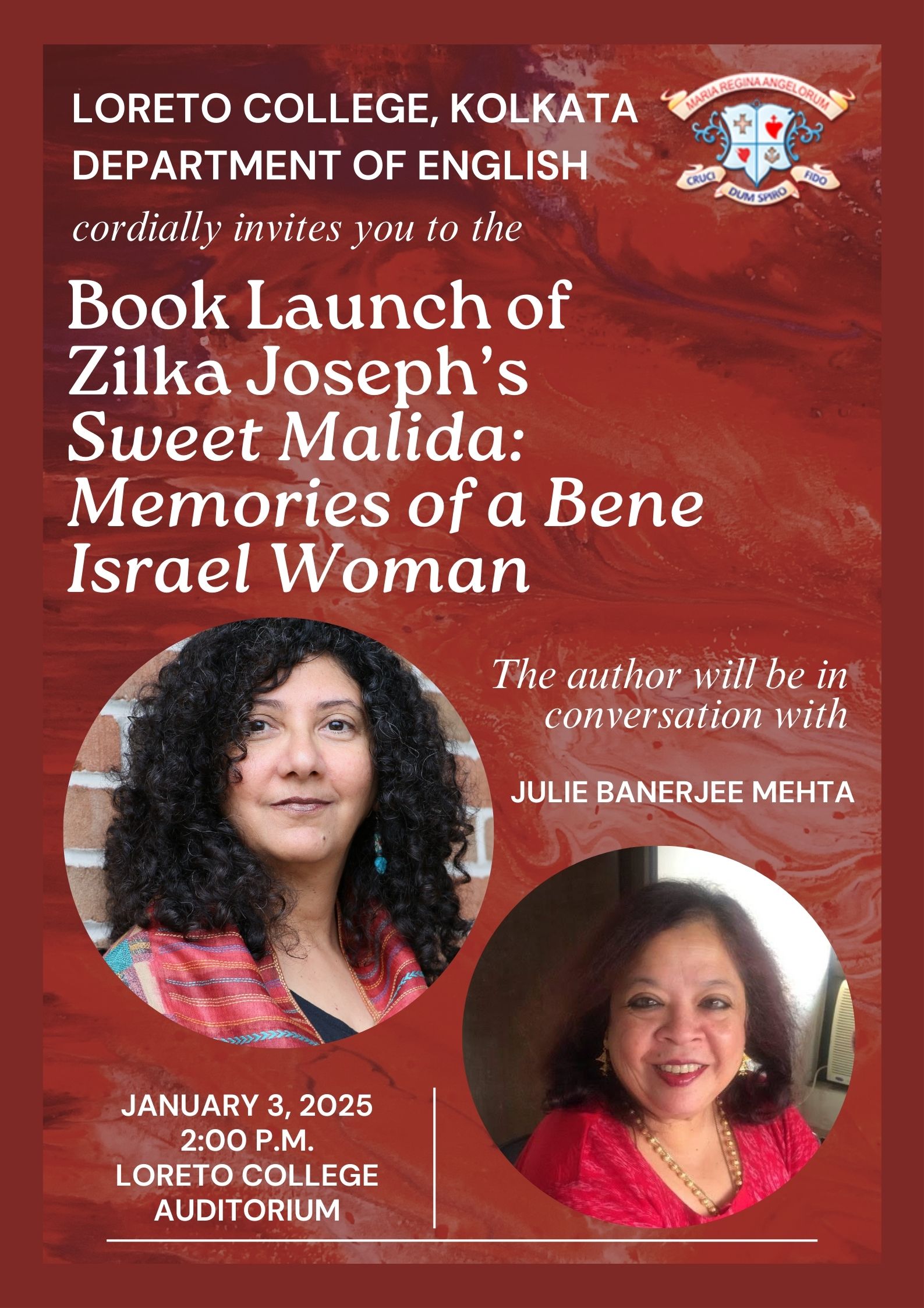 On January 3, 2025, the Department of English, Loreto College, Kolkata organised the book launch of Zilka Joseph's Sweet Malida: Memories of a Bene Israel Woman. Conducted in a hybrid mode, the event was attended by the UG and PG students of the college, faculty of the Department of English, family members and friends of the author, as well as retired professors of the college and guests.
