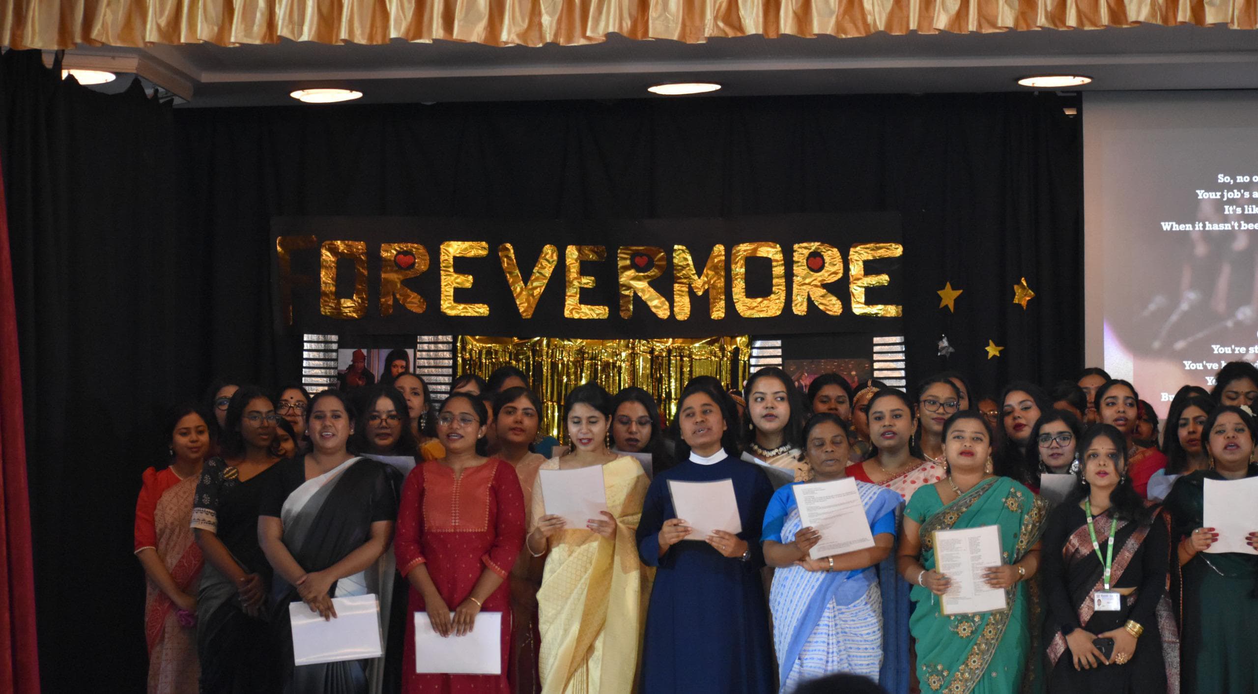 Soon after, the class song was performed, evoking a sense of nostalgia. An address was delivered by the Head of the Department, Dr. Kaustuva Banerjee, after which the Teacher-in-Charge, Sr. Dr. A. Nirmala, encouraged and attentively listened to the colourful and varied journeys of the students who had been part of the department in the past. A convivial cake-cutting ceremony followed. The day ended on a bittersweet note with the everlasting theme "Forevermore."