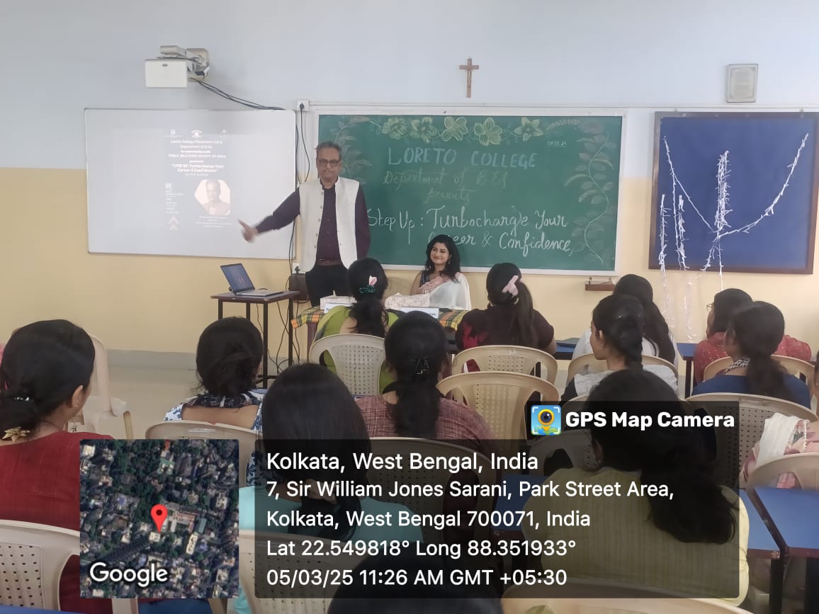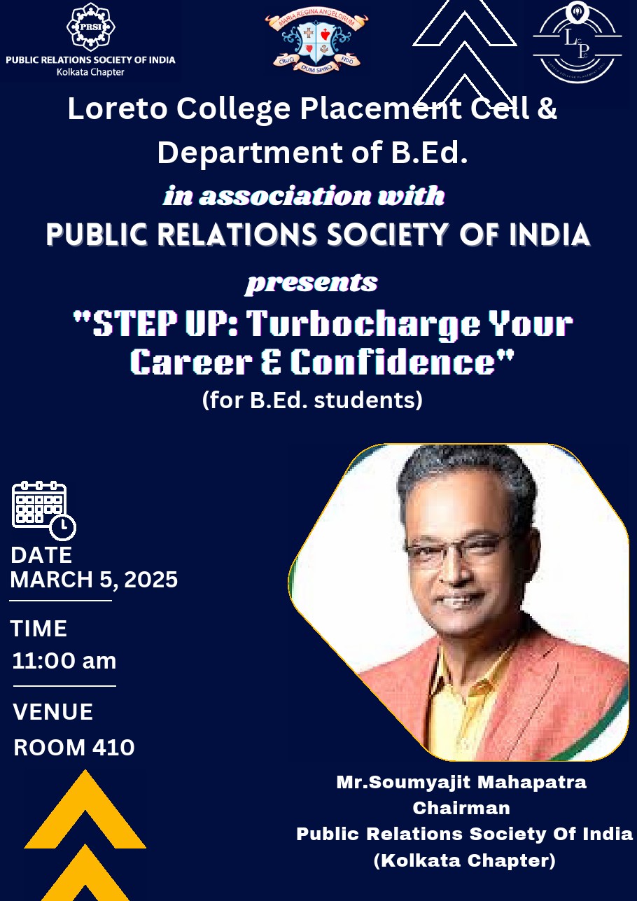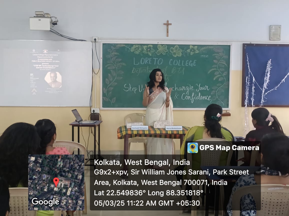 On 5th March 2025, the Placement Cell of Loreto College and the Department of B.Ed., in collaboration with the Public Relations Society of India, organized a workshop on CV writing titled Step Up: Turbocharge Your Career and Confidence for the final-semester students of the Department of B.Ed. The session aimed to equip students with essential skills for crafting professional CVs, a crucial step as they prepare to embark on their teaching careers.