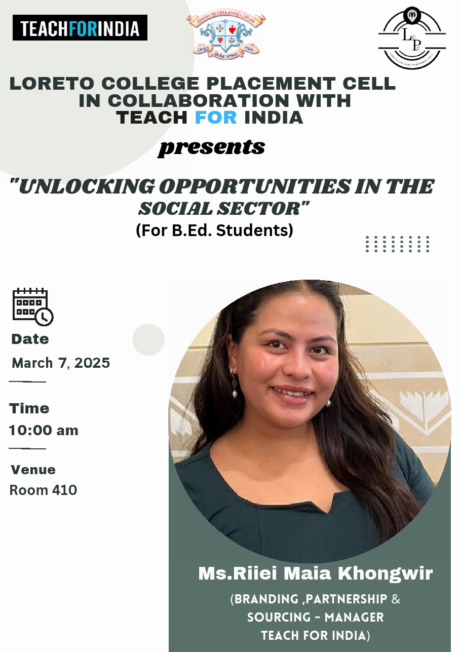 The Placement Cell of Loreto College, in collaboration with Teach For India, organized an insightful and enriching workshop on 'Unlocking Opportunities in the Social Sector' on 7th March 2025. The session was specifically designed for the final-semester students of the Department of B.Ed., offering them a deeper understanding of the transformative role of education in shaping society.