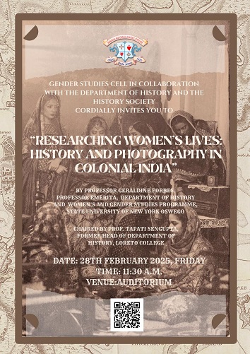 Geraldine Forbes, a renowned scholar in the field of visual culture and memory studies from New York. On February 28, 2025, she delivered a compelling presentation on the significance of photographs as vessels of memory and tools for construction of feminist history. This event was organized by the Department of History in collaboration with Gender Studies Cell.