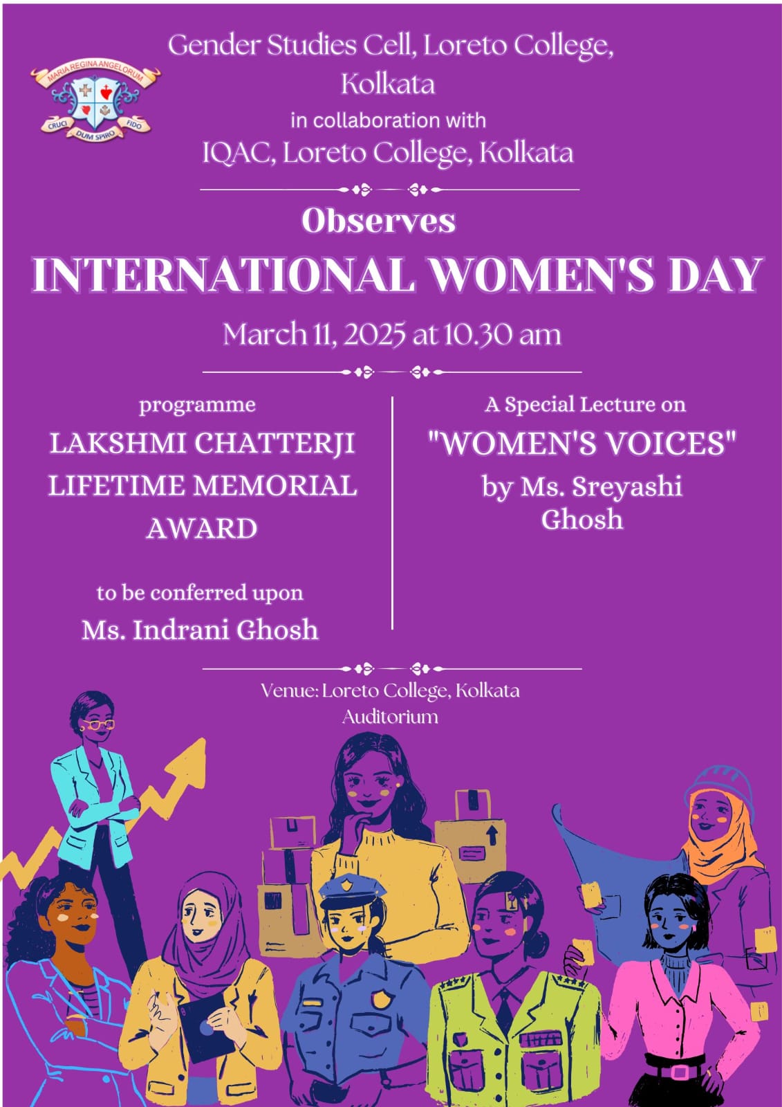 Loreto College, Kolkata observed International Women's Day on March 11, 2025 with its objective to empower women. The event was organized by the Gender Studies Cell in collaboration with the Internal Quality Assurance Cell. The event commenced with the welcome speech by President Sanjula Shanker followed by the lightening of lamp and an opening prayer. Sister Nirmala addressed the gathering, sharing her thought-provoking speech on women's empowerment.