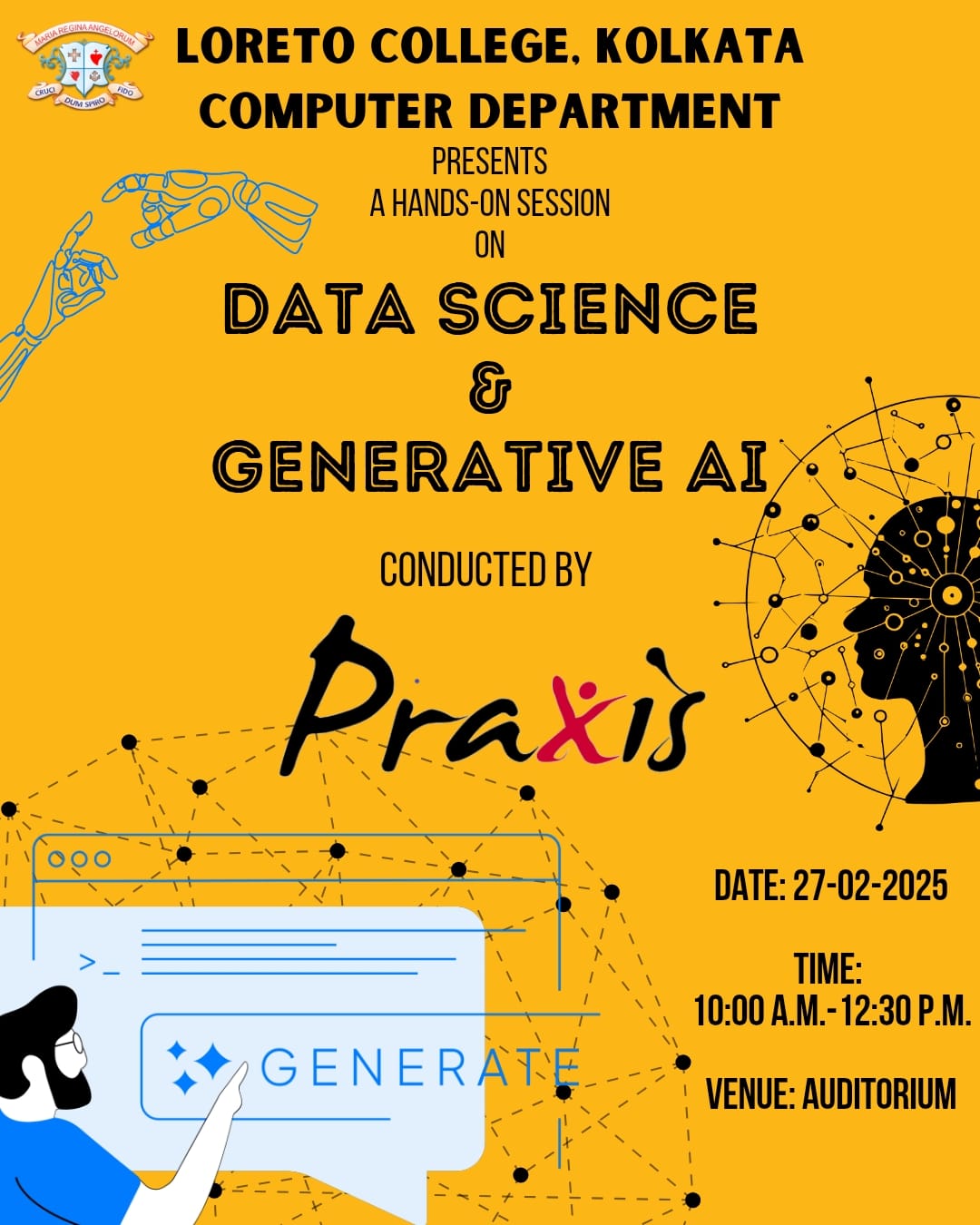 Computer Department of Loreto College, Kolkata organized a hand-on session on 'Data Science & Generative AI' by Praxis Tech School on 27th February 2025, providing students with an opportunity to gain practical knowledge and insights into the field of AI and data analytics. The event was attended by undergraduate, along with B.Ed students. The diverse participation showcased the growing interdisciplinary interest in AI applications across different academic fields. The session was led by Dr.Sourav Saha, the Director of Data Science & Dean Academics at Praxis and his team, who provided a well-structured, engaging, and informative presentation. Their expertise in the field helped students understand the theoretical and practical aspects of AI and data science.