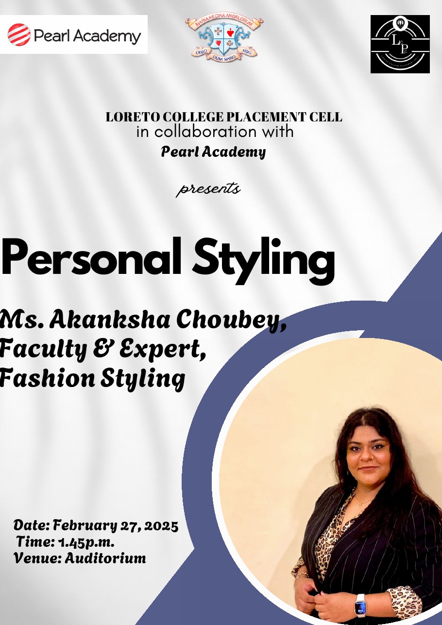 On February 27, 2025, the Loreto College Placement Cell, in collaboration with Pearl Academy, organised an engaging and insightful session on Personal Styling. The session was conducted by Ms. Akanksha Choubey, an esteemed faculty member and expert in fashion styling. The session aimed to illuminate the profound connection between personal image, self-presentation, and the psychology of perception, particularly in professional and social settings.