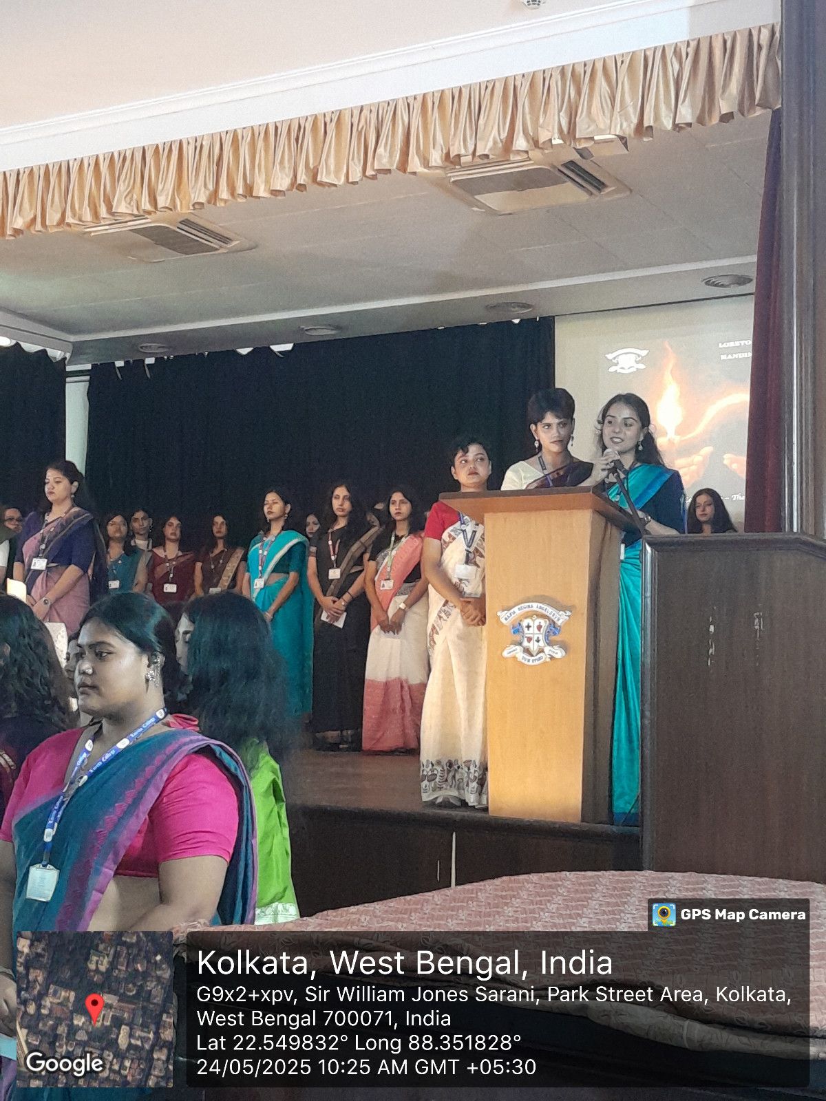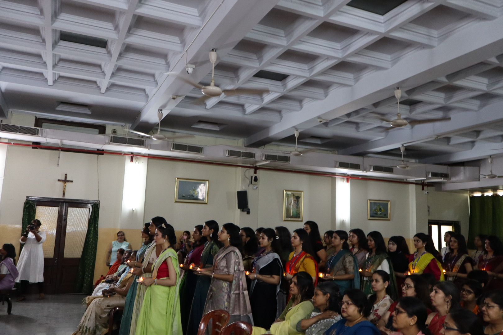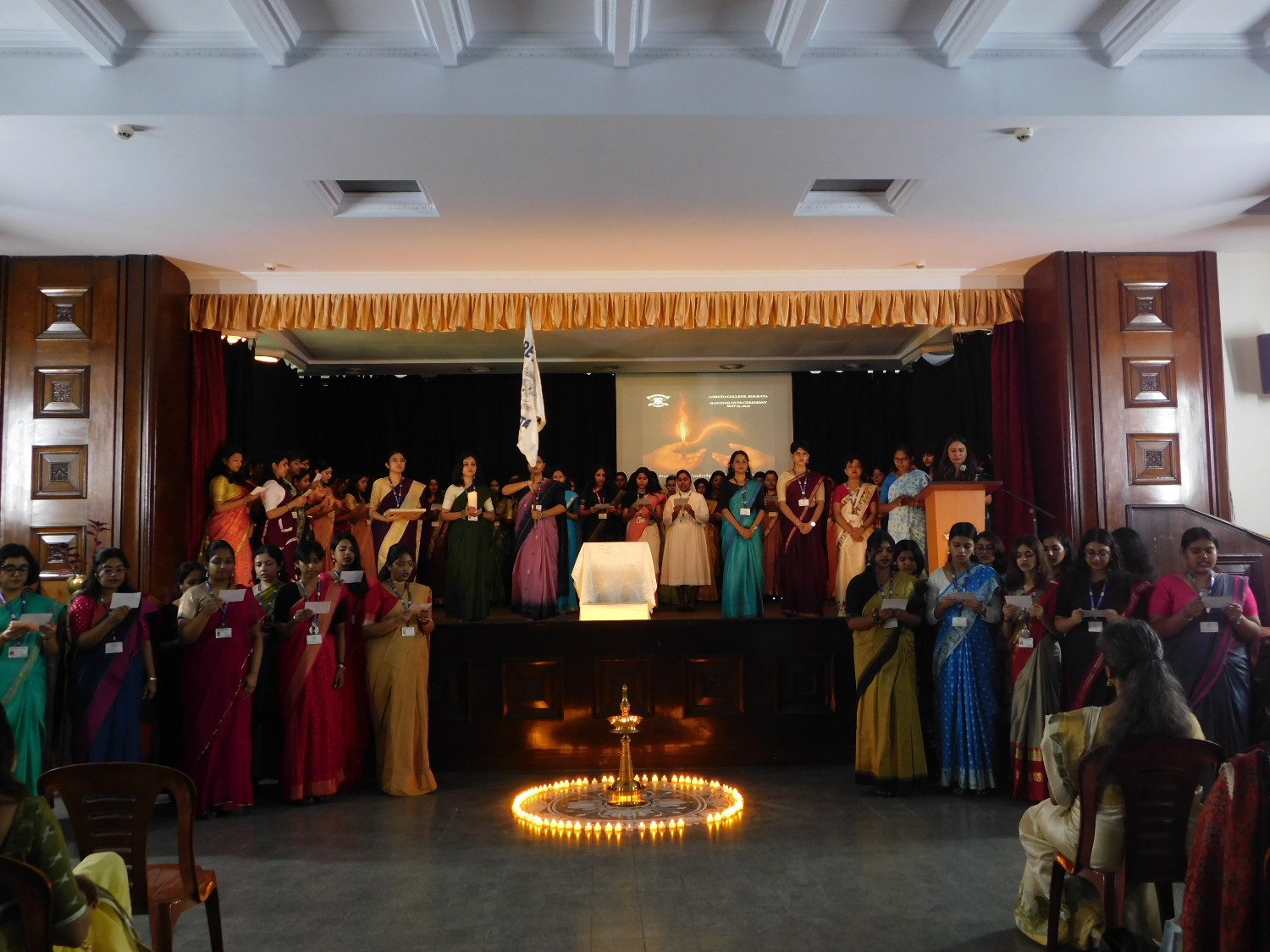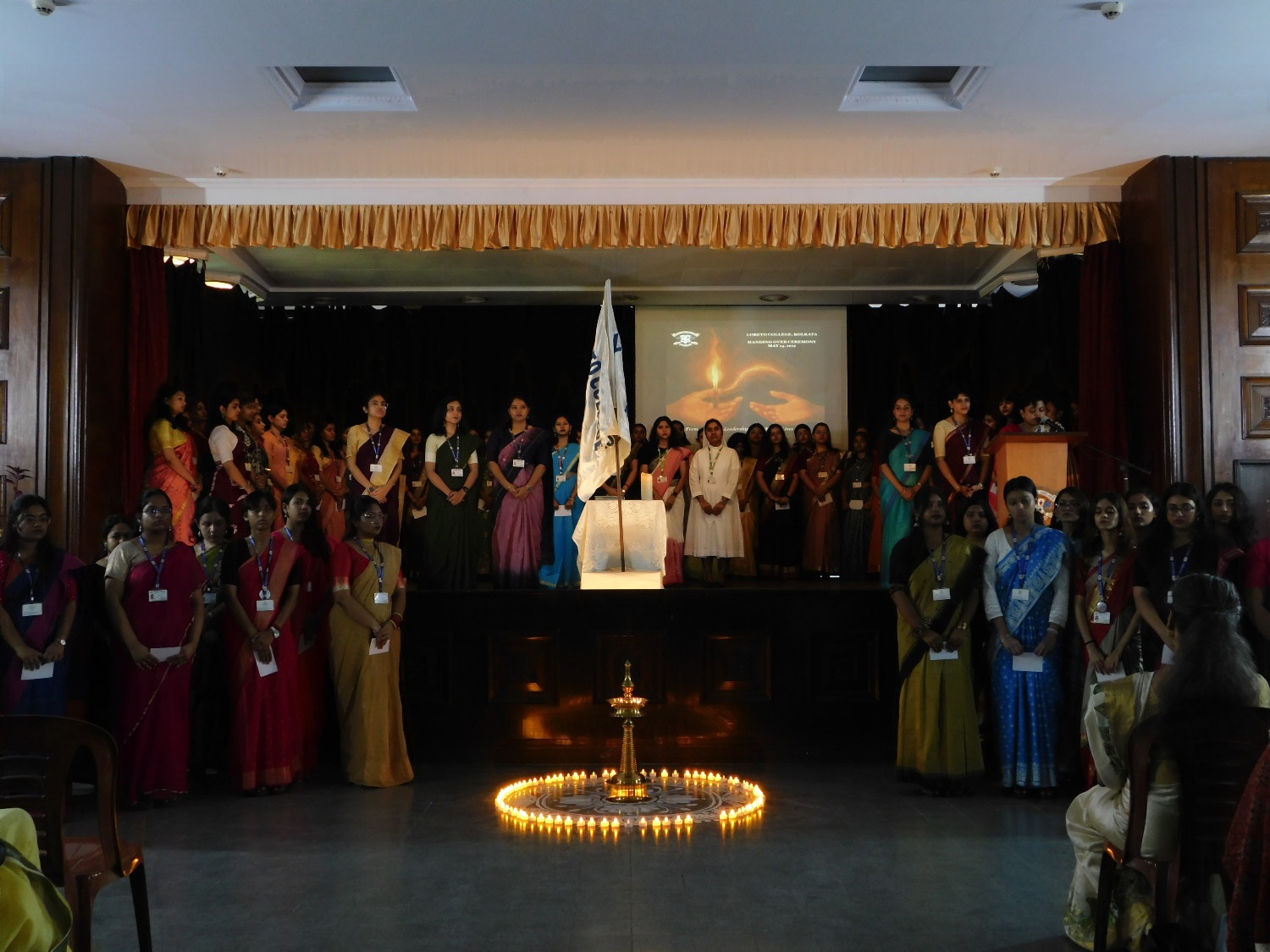 The Handing Over Ceremony of the Loreto College Student Council (2024-2025) was held on 24th May, 2025, with the theme "From Legacy to Leadership - The Flame Lives On." The event began at 10:00 a.m. with soft instrumental music as faculty members, students, and parents gathered in anticipation. The ceremony commenced with the traditional lighting of the lamp by Sr. Dr. A. Nirmala, Chief Guest Dr. Charlotte Simpson Veigas, and senior faculty member Mangala Chakravarty. A symbolic candle walk followed, during which each Student Council member placed a candle around the lamp as the names of each society's President, Vice-President, and Treasurer were announced.