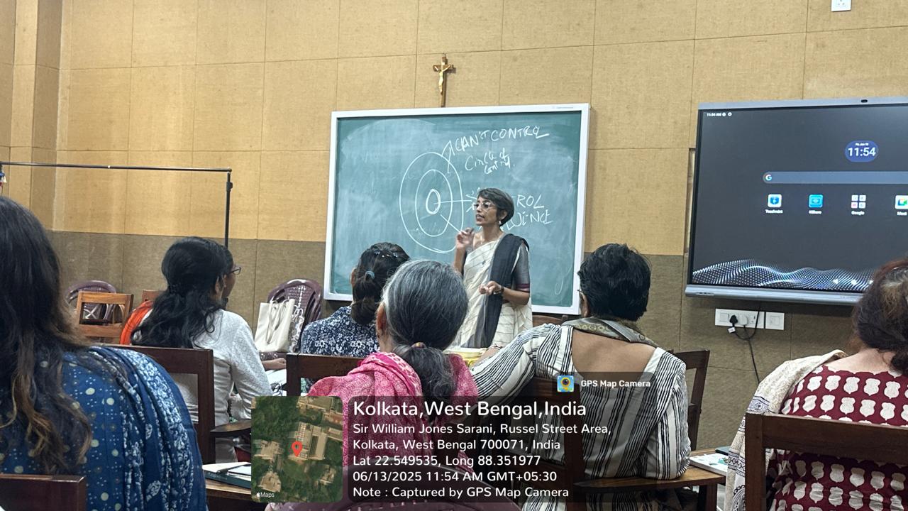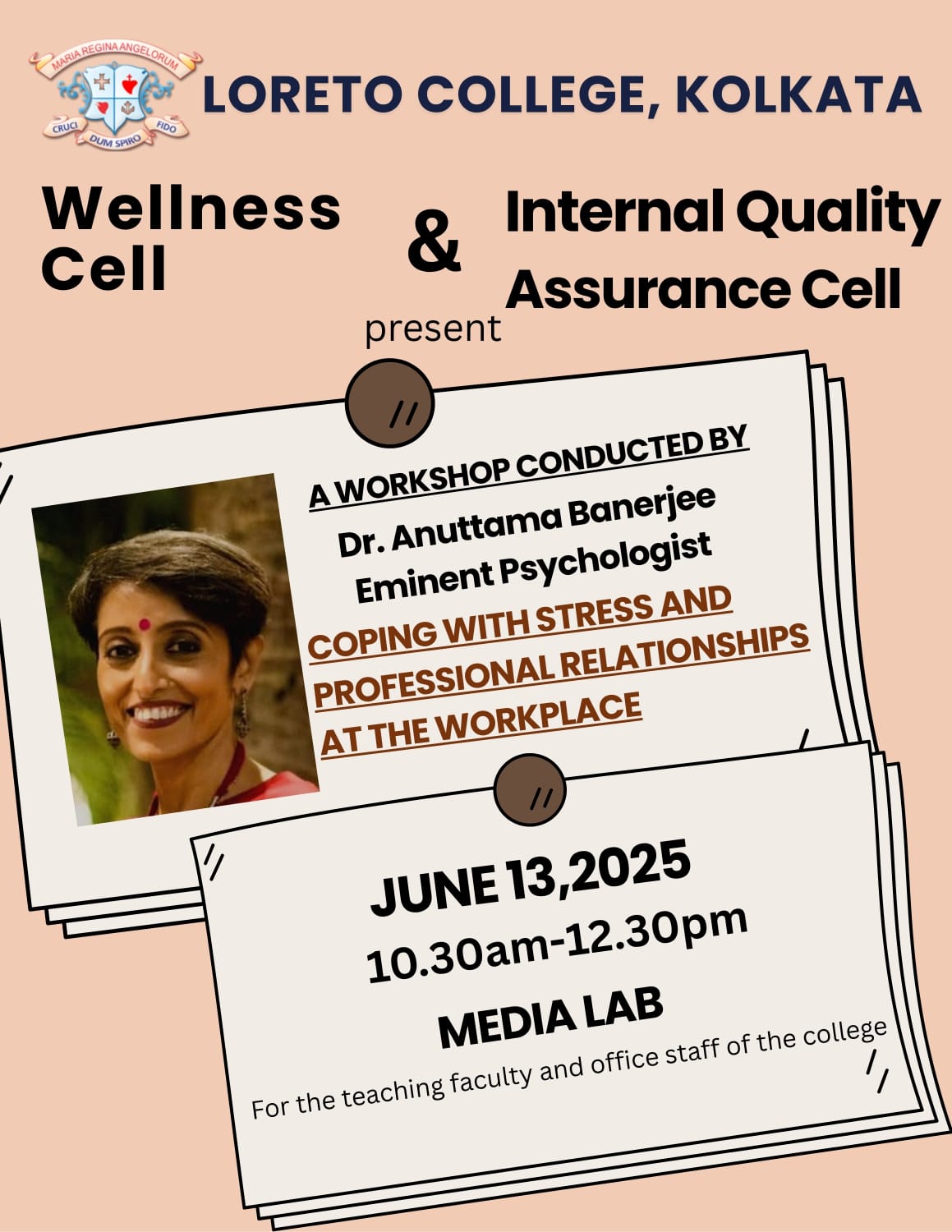 A workshop titled "Coping with Stress and Professional Relationships at the Workplace" was organized by the Wellness Cell of Loreto College in collaboration with the Internal Quality Assurance Cell (IQAC). The session was conducted by Dr. Anuttama Banerjee, an eminent psychologist.