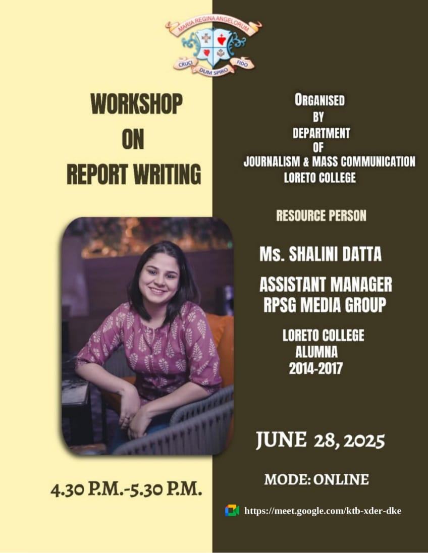 On June 28, 2025, the Department of Journalism and Mass Communication, Loreto College, hosted an online workshop on Report Writing for all the report writers of the societies, cells and the B.Ed. The resource person for the workshop was Ms. Shalini Datta, a seasoned specialist in social media and multimedia communications. With over 7-8 years of professional experience in the media industry, Ms. Datta shared valuable insights into effective and ethical reporting.