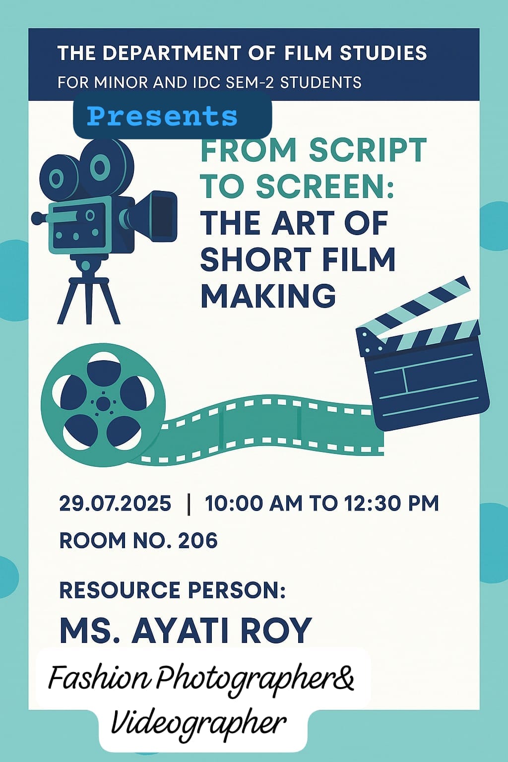 A highly engaging and educational Photography and Videography Workshop titled 'From Script to Screen: The Art of Short Film Making' was organised by the Film Studies Department on Tuesday, the 29th of July, 2025, at Loreto College, exclusively for the minor and IDC students of Film Studies. The workshop was facilitated by Ms. Ayati Roy, a renowned cinematographer and fashion photographer known for her creative vision and expertise in visual storytelling.