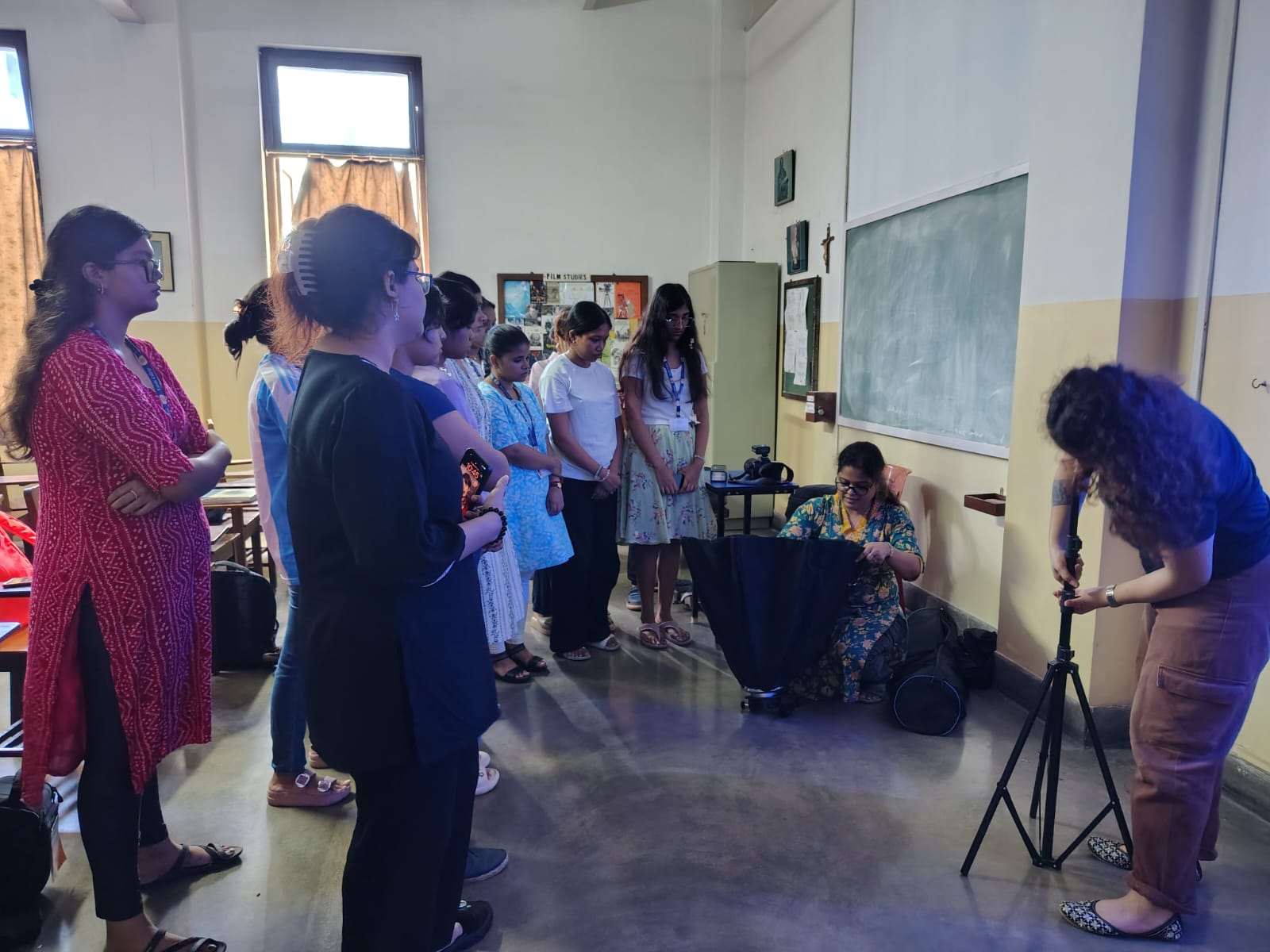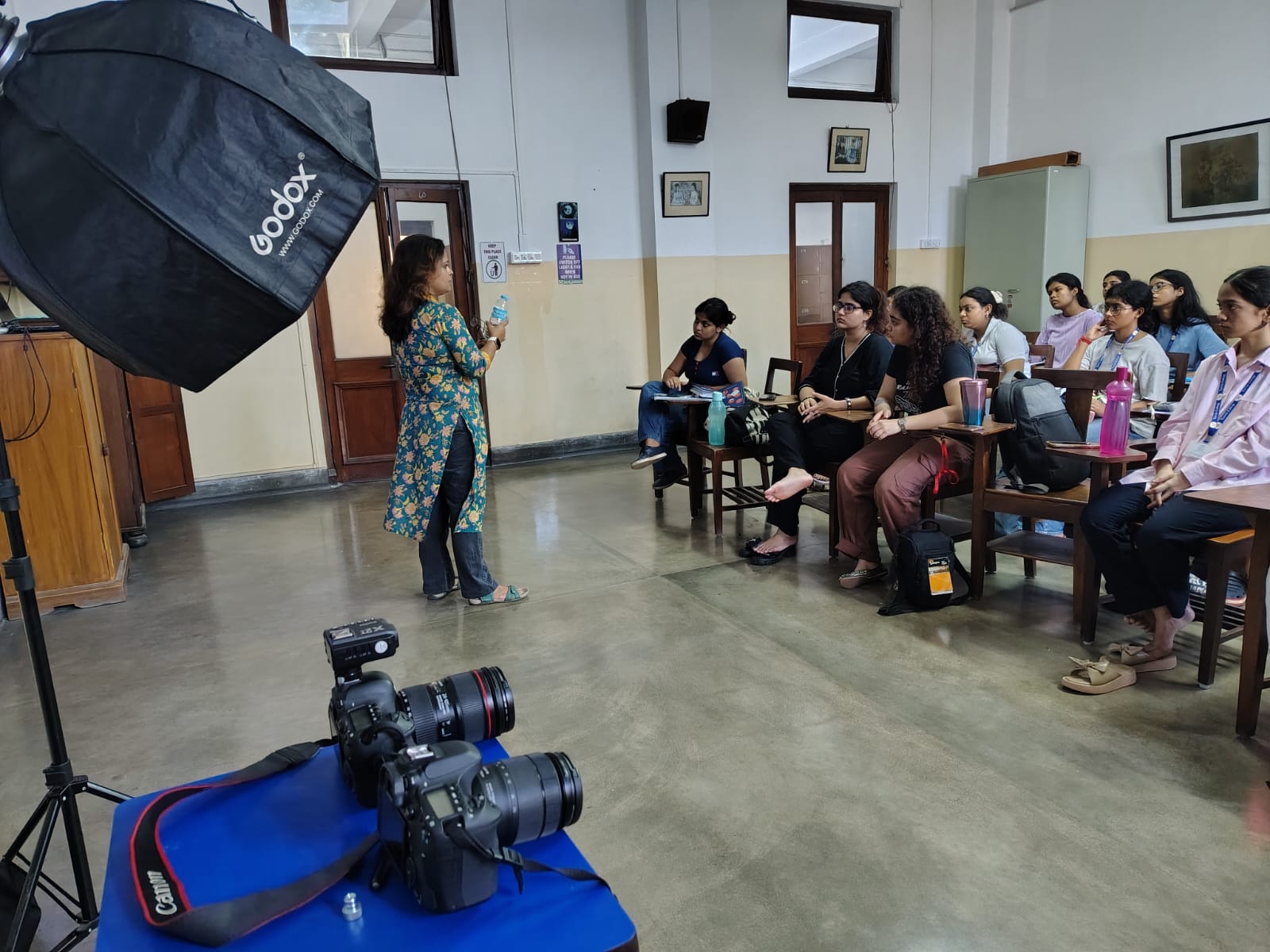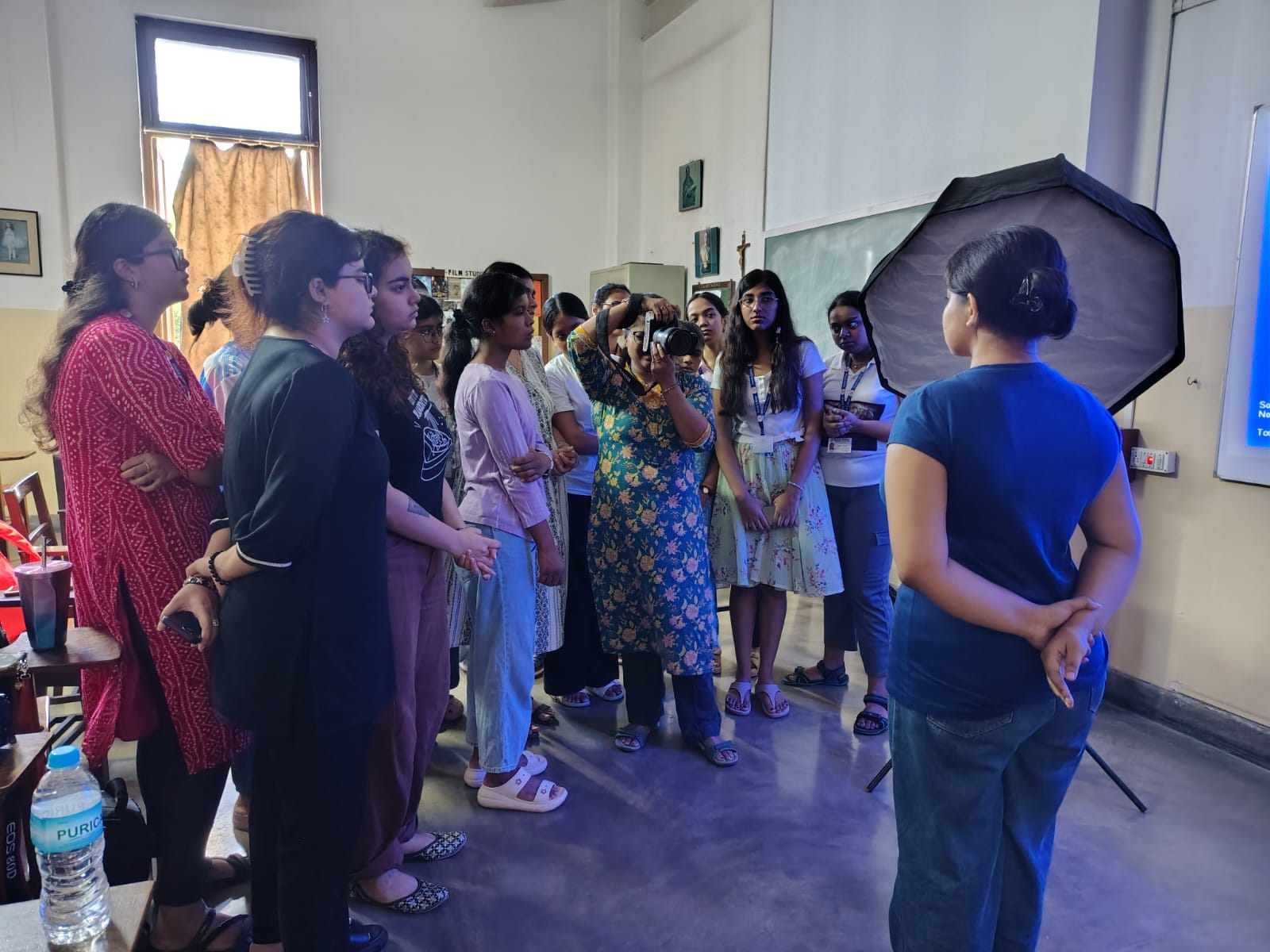 Ms. Roy also provided an overview of essential photography and videography equipment, demonstrating the use of tools such as portable lights, triggers, and diffusers. Students were given the opportunity to engage in hands-on practice, allowing them to familiarize themselves with the equipment and apply the theoretical concepts in real time.