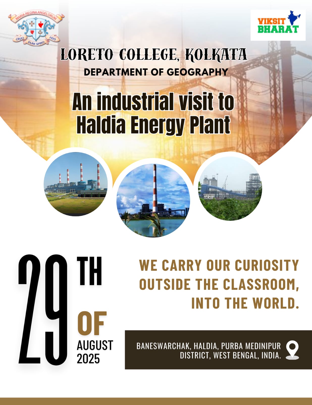 The Department of Geography of Loreto College, Kolkata organized an Industrial visit to Haldia Energy Plant on 29th August, 2025. The students of semester III and three faculty members from the Department of Geography, Loreto College, visited one of the biggest thermal power plants of India for an educational excursion aimed at promoting curiosity outside the classrooms, into the world. The plant is located in the district of Purba Medinipur. The visit facilitated improved observation, note-taking, teamwork, and report-writing abilities by documenting and analyzing the field experience.