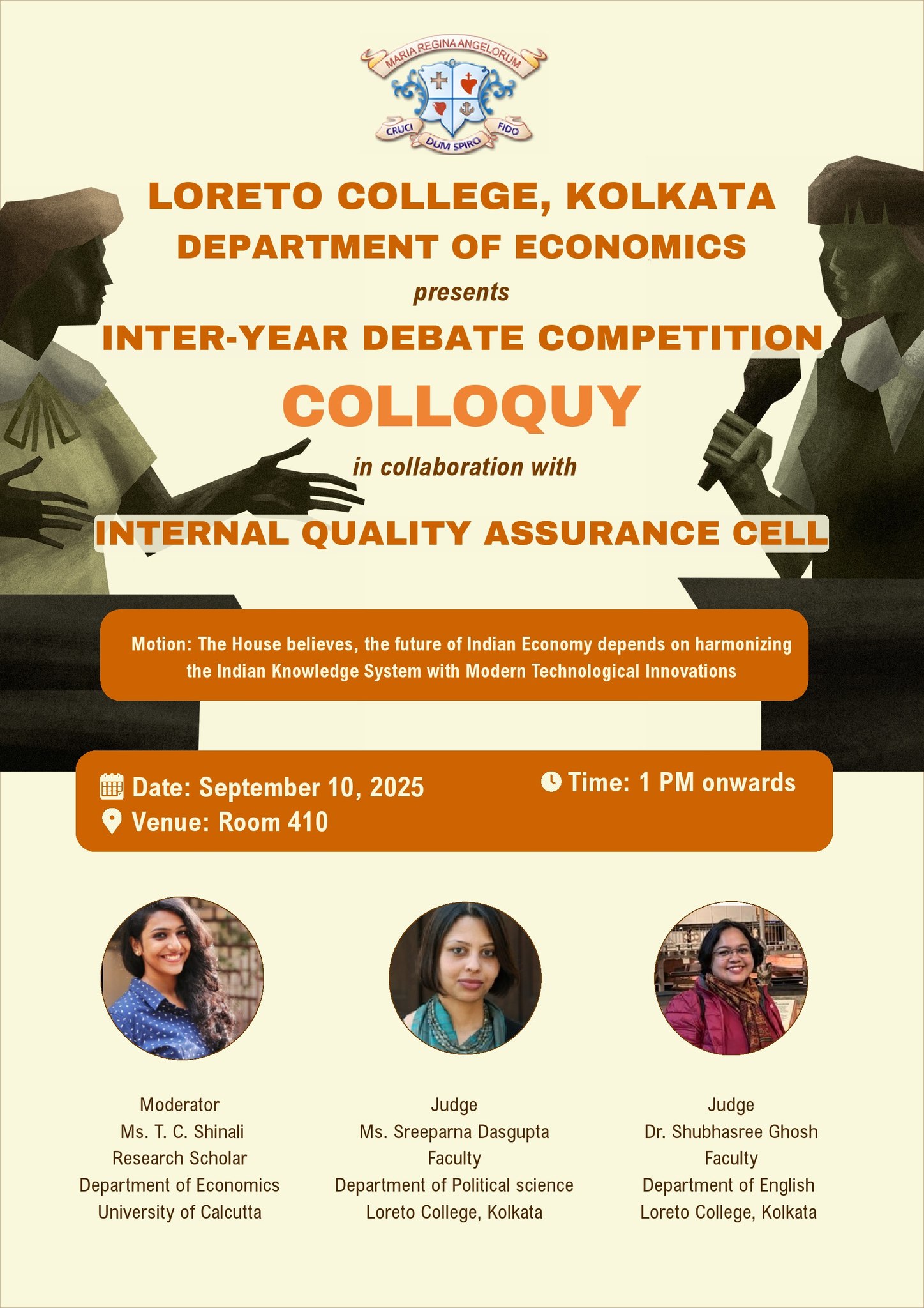 On 10th September 2025, the Department of Economics, Loreto College, Kolkata, in collaboration with the Internal Quality Assurance Cell, hosted its annual inter-year debate competition, Colloquy 2025. The motion for the debate was: "The House believes, the future of the Indian Economy depends on harmonizing the Indian Knowledge System with Modern Technological Innovations."