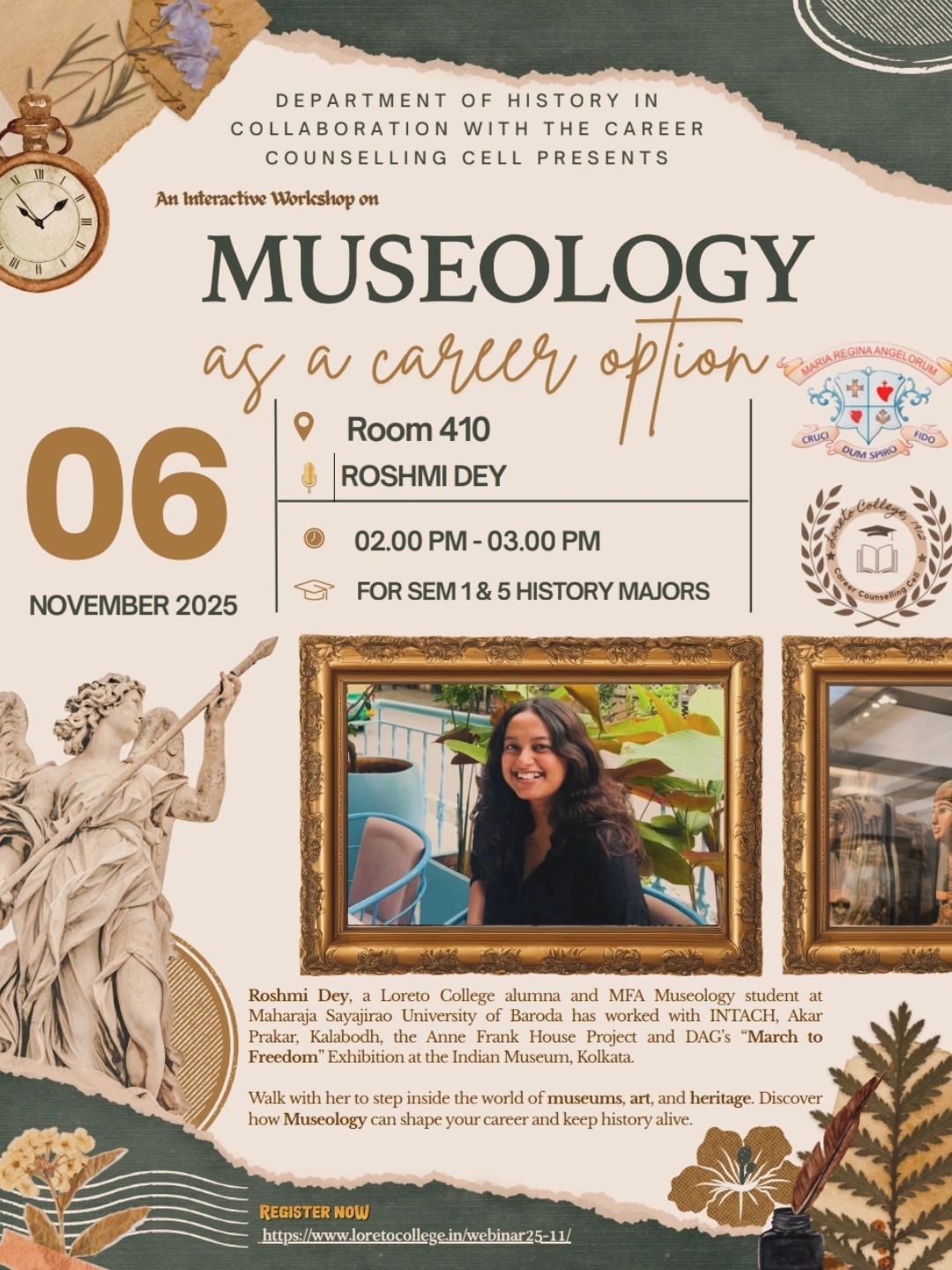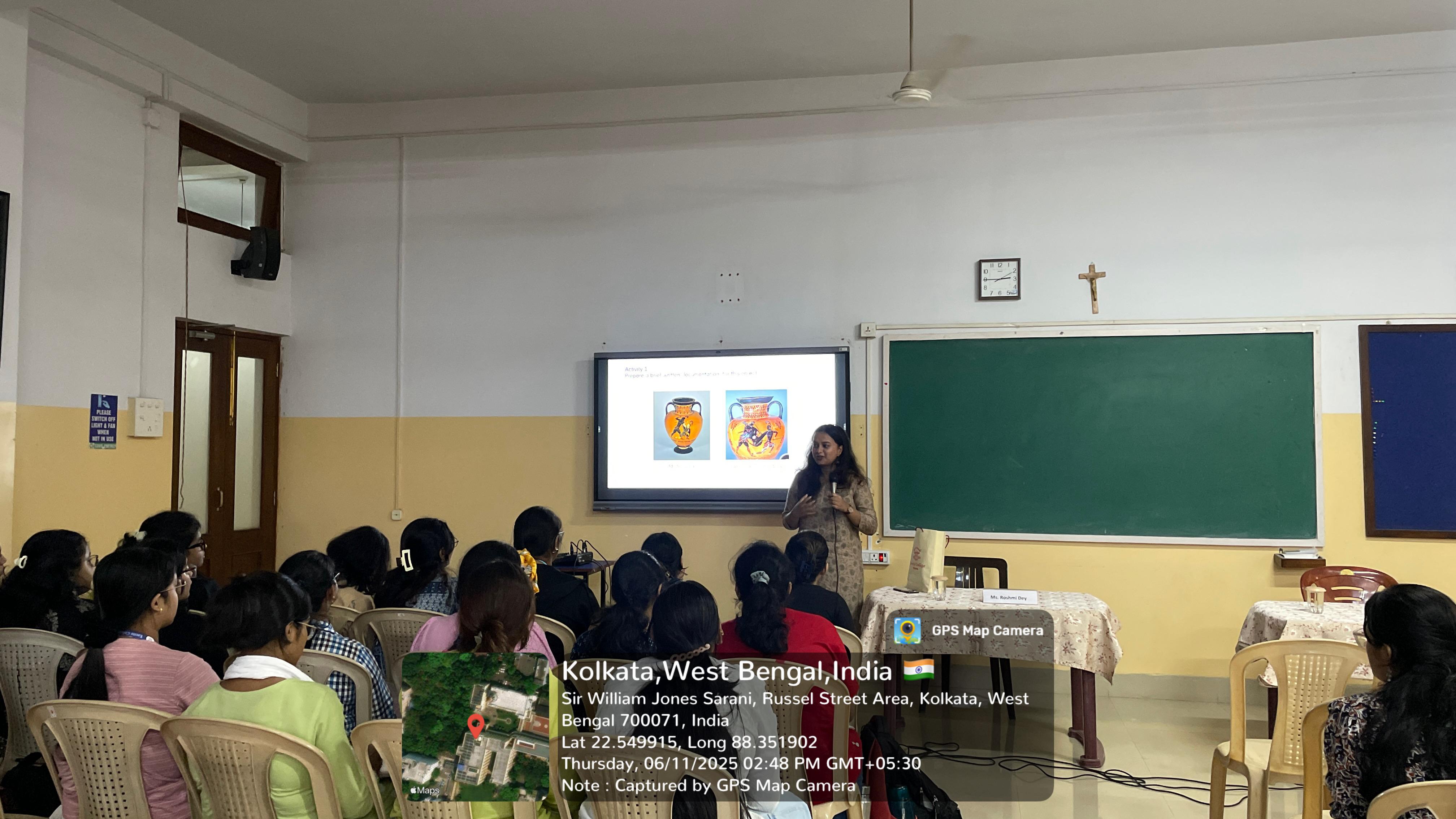 A workshop on "Museology as a Career Option" was held on 6th November 2025 at Loreto College organized by the Department of History in collaboration with the Career Counselling Cell for the Semester I and Semester V History Major students. The resource person for the session was Ms. Roshmi Dey, an alumna of the Department of History, Loreto College and a current student of Museology, who shared valuable insights drawn from her academic and professional experiences in the field.
