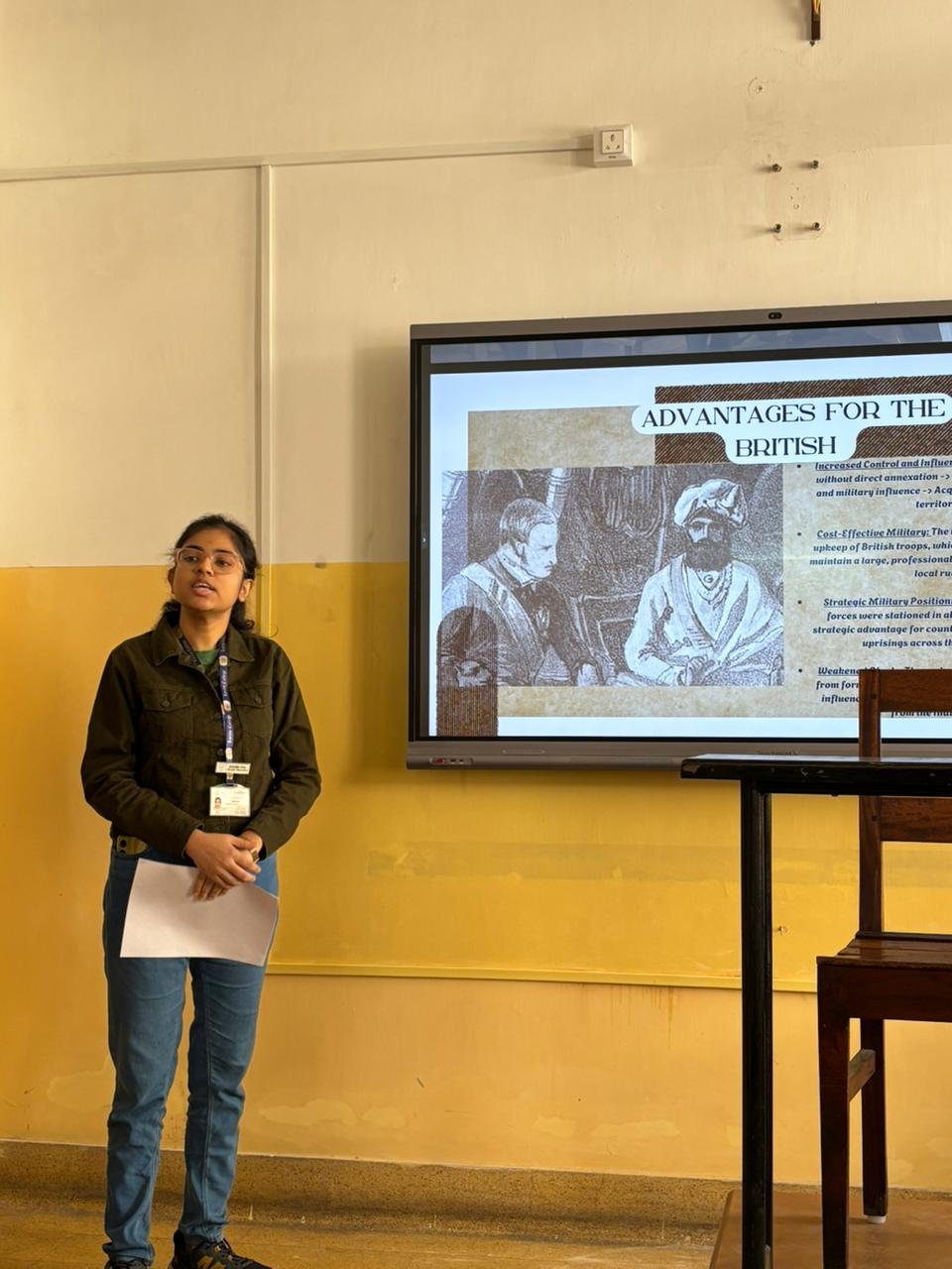 A total of 28 students participated in the programme and were divided into seven groups of four members each. The broad topic for the sessions was British Colonial Expansion in India. Each group was assigned a sub-topic such as the Anglo-French Carnatic Wars, Anglo-Mysore Wars, Anglo-Maratha Wars, Anglo-Sikh Wars, Anglo-Awadh War, The Subsidiary Alliance, and The Doctrine of Lapse. Each group presented its research and interpretation of these events, highlighting their causes, courses, and consequences. The presentations were supported by vibrant and relevant PowerPoint slides, which helped to make the sessions both informative and engaging.