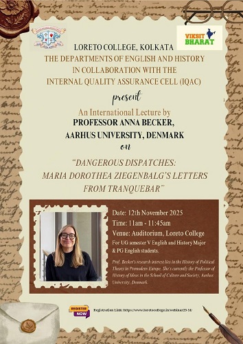 The Departments of English and History, Loreto College, Kolkata, in collaboration with the Internal Quality Assurance Cell (IQAC), organized an International Lecture on 12th November 2025. The session, titled "Dangerous Dispatches: Maria Dorothea Ziegenbalg's Letters from Tranquebar", was delivered by Professor Anna Becker from Aarhus University, Denmark.