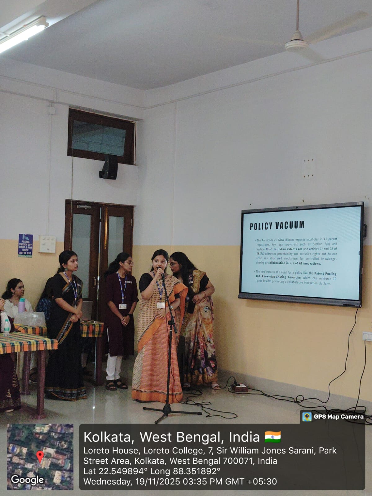 Parallel to the debate competition, was held a intensely brainstorming policy ideation competition, IPR Policy Parley, fostering analytical and policy-writing skills. In presence of distinguished judges Dr. Sitangshu Khatua, Dean of Xavier's Business School Kolkata and Dr. Samprit Chakrabarti, Dean, School of Business, Adamas University, Kolkata, participants worked on a detailed case study requiring them to draft comprehensive policy proposals. The event consisted of two phases: an initial pitch of policy recommendations and a second phase titled "The Open-Source Defence," where teams responded to a scenario twist in real time. Students demonstrated exceptional clarity, strategic thinking, and interdisciplinary understanding as they worked on issues such as innovation incentives, AI regulation, digital privacy, and fair access to intellectual property. Awards were presented across multiple categories, with Loreto College securing Best Team, while students from Amity University and Bethune College stood as runners-up.