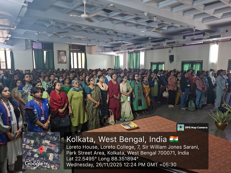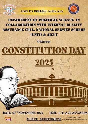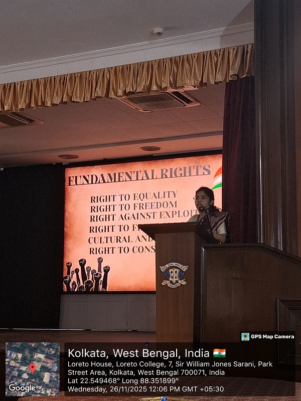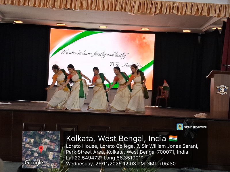 Loreto College celebrated Constitution Day as part of its annual academic event on November 26, 2025. The programme commenced at 11:45 a.m. with a prayer song and hymn presented by students of the AICUF Society, followed by the ceremonial lighting of the lamp by Dr. Amrita Dasgupta, IQAC Coordinator, along with Student Council President Anuja Prasad and Vice President Atryee Banerjee, marking the formal inauguration of the day's proceedings. Ms. Soumi Pal, College Treasurer, served as the Master of Ceremonies. The inaugural session also featured a vibrant student dance performance celebrating nationalist spirit.