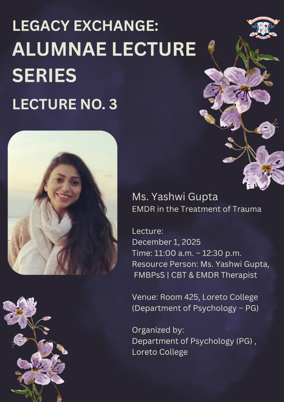 Venue: Room 425, Department of Psychology (PG), Loreto CollegeThe third session of the Legacy Exchange: Alumnae Lecture Series was held on December 1, 2025, in Room 425 of the Department of Psychology (PG), Loreto College. The session was delivered by Ms. Yashwi Gupta, an accomplished CBT and EMDR therapist (FMBPsS) and a distinguished alumna of the department. Her lecture focused on the clinical application of Eye Movement Desensitization and Reprocessing (EMDR) in trauma treatment, offering postgraduate students a structured and academically grounded overview of trauma-informed practice. Speaking both as a clinician and as a former student, Ms. Gupta created an immediate sense of continuity, strengthening the connection between academic training and professional practice.