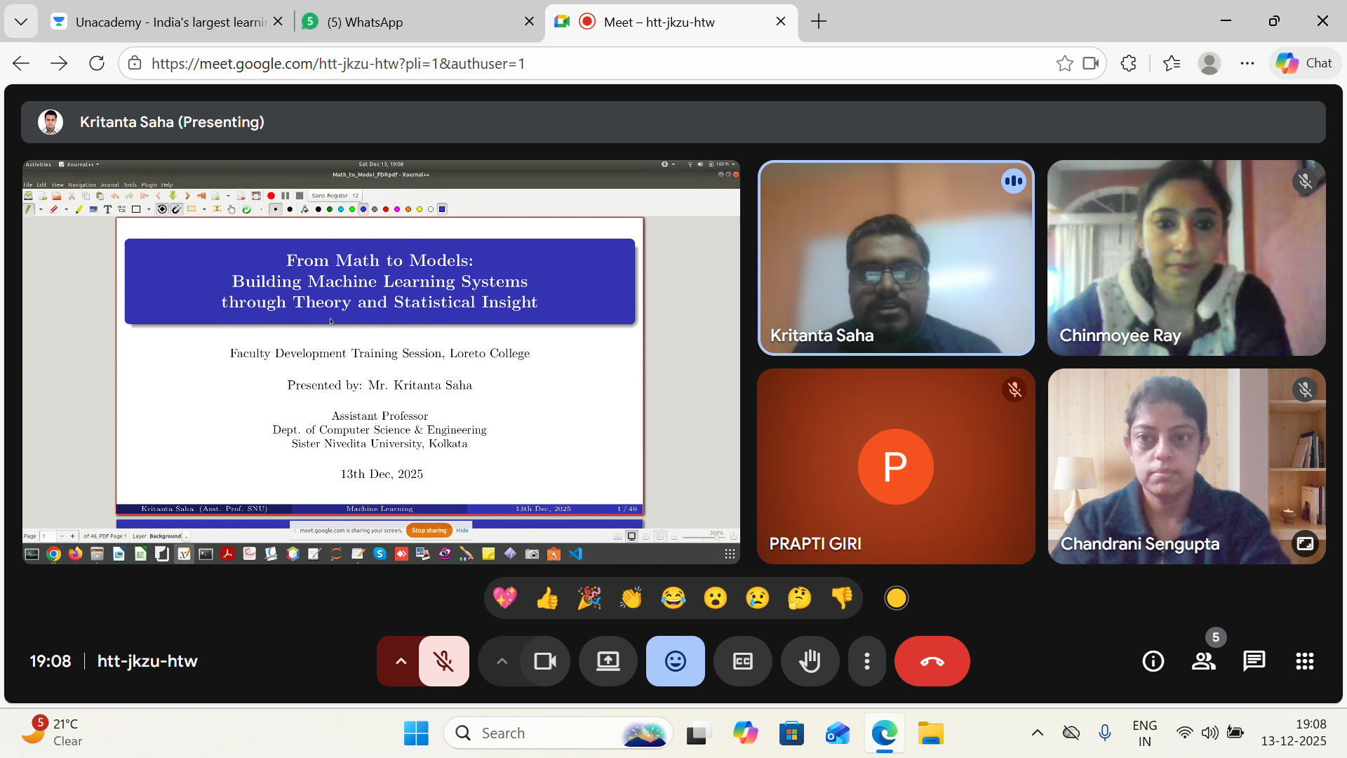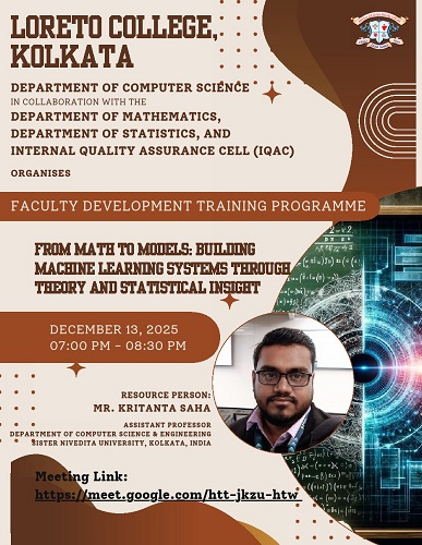 The Department of Computer Science, Loreto College, in collaboration with the Department of Mathematics, the Department of Statistics, and the Internal Quality Assurance Cell, organised an online Faculty Development Training Programme on 13th December, 2025 from 7:00 PM to 8:30 PM. The session was conducted through Google Meet platform.