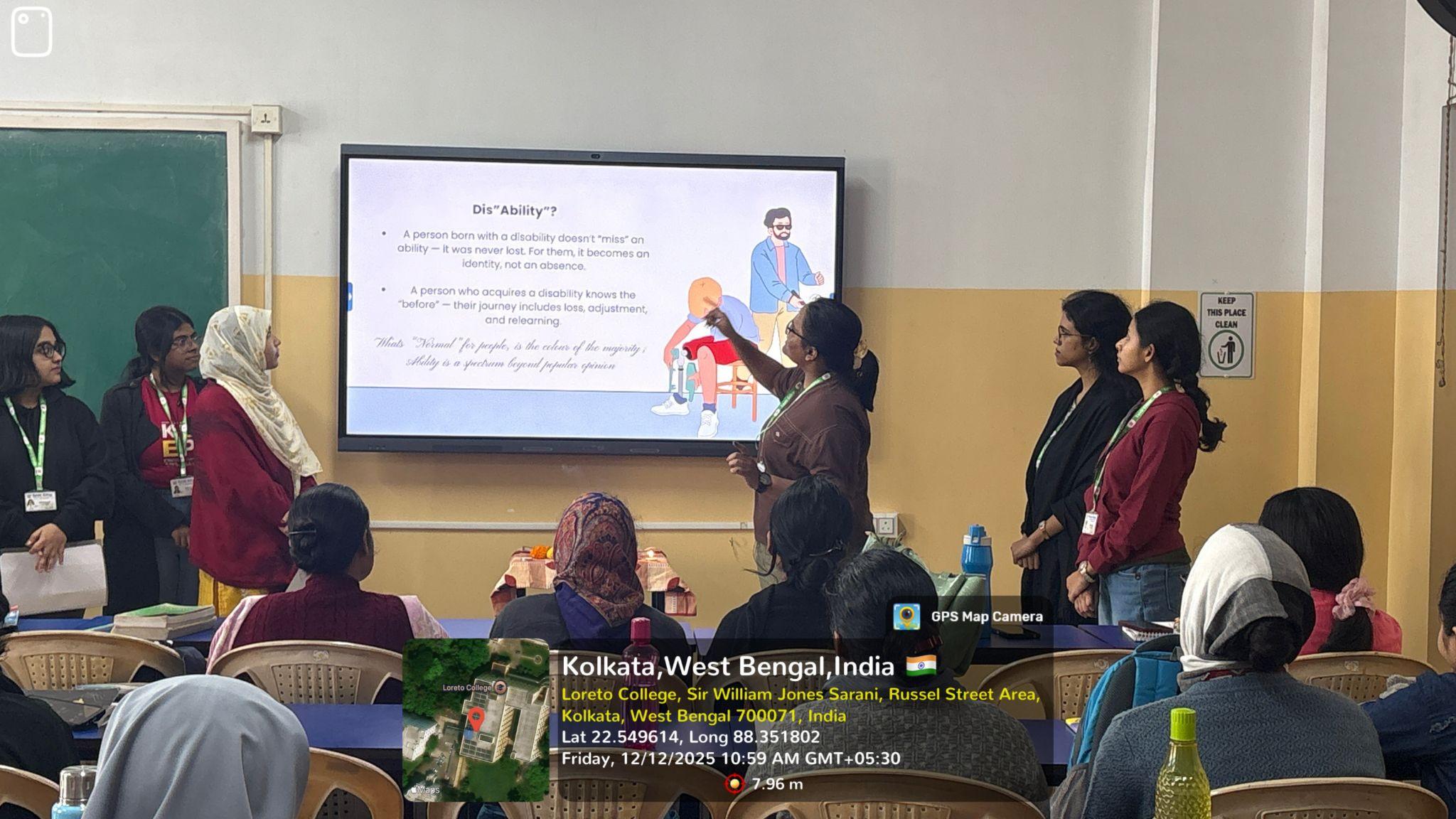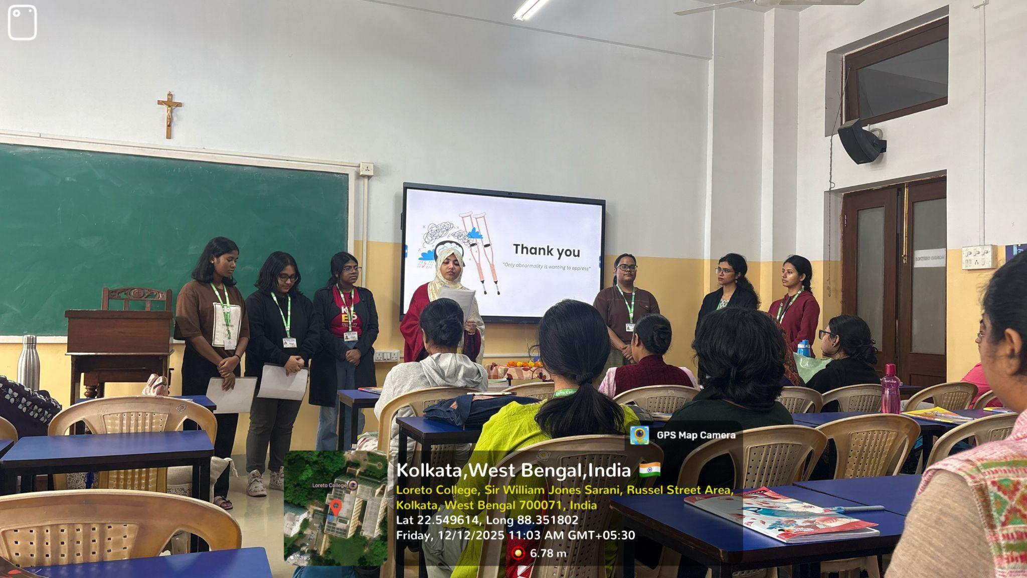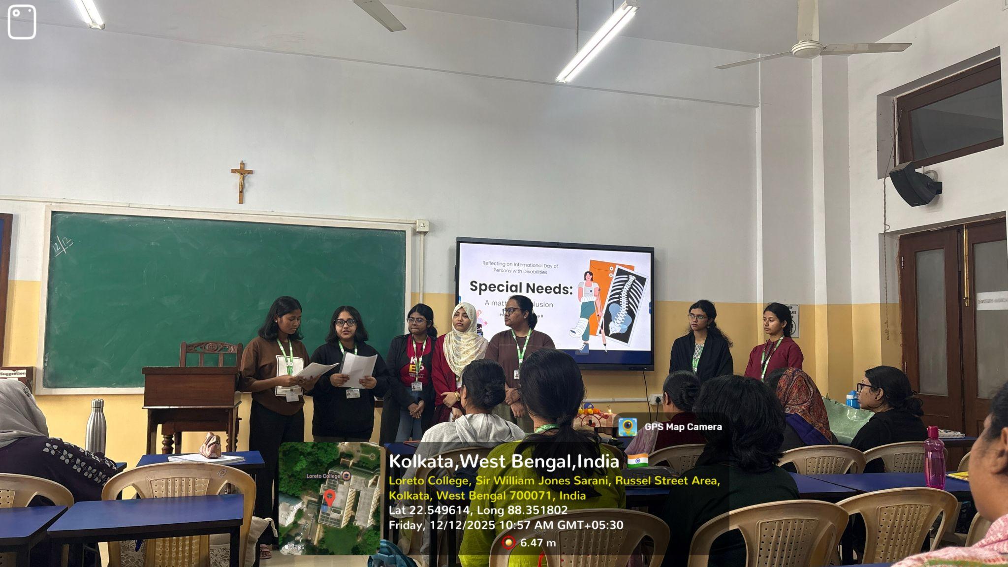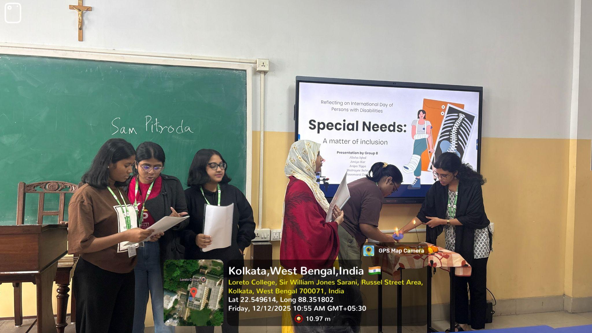 On 12th December 2025, the following students (Alisha Iqbal, Amiya Kar, Anipa Tigga, Shreemanti Datta, Maitrayee Saha) from the Department of B.Ed., Semester 1 conducted the class assembly on the theme, "Special Needs- A Matter of Inclusion and not Seclusion" at Loreto College B.Ed classroom (Room no. 405) to spread social consciousness. The assembly highlighted the physical, psychological, and social requirements of people with special needs while stressing the need for awareness and empathy. By presenting the categories and intensities of special needs, the assembly urged the audience to reflect on the dangers of secluding such people and the importance of including them into the mainstream of society.