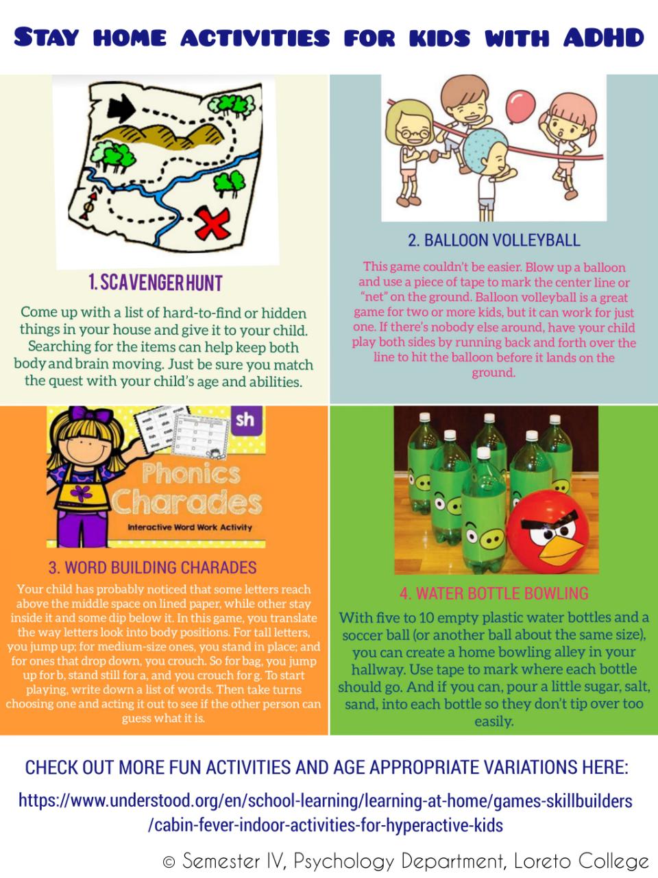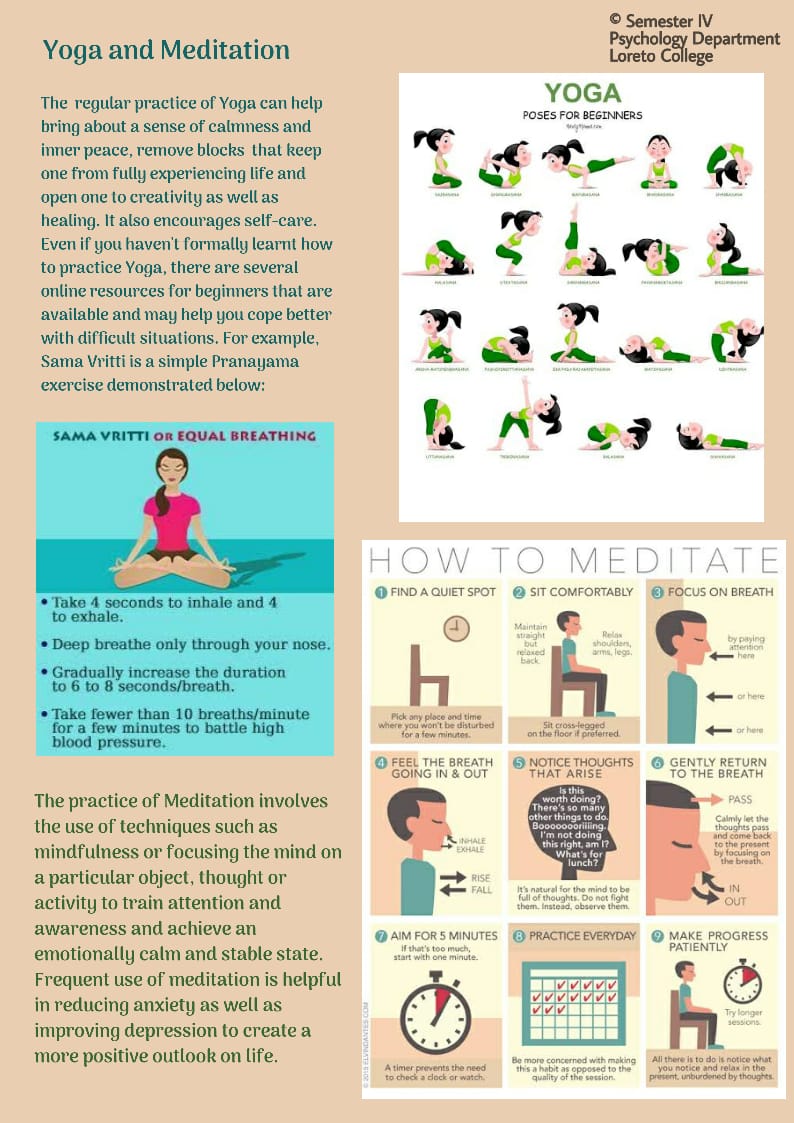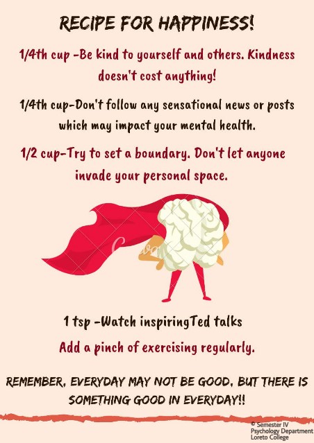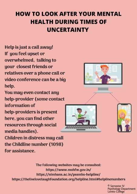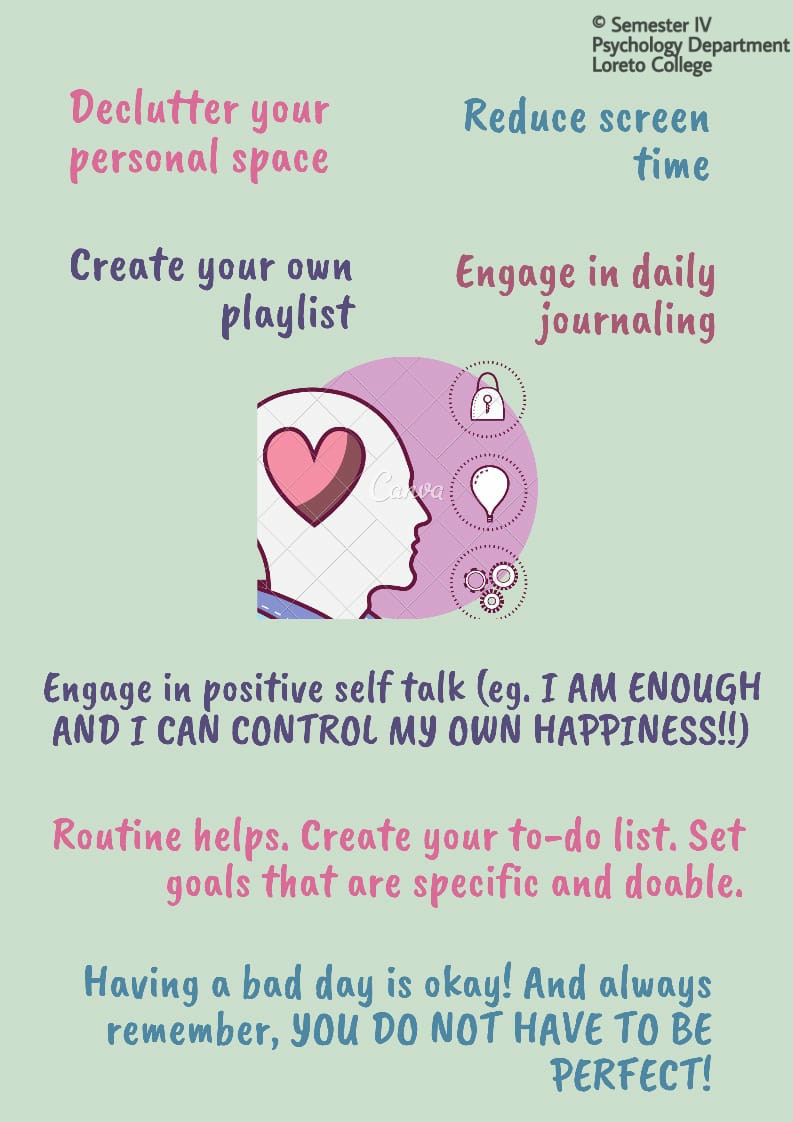 A few posters were made by some of the students from Sem IV of the Department of Psychology as part of a class assignment on their curriculum topic - Intervention and Evaluation in Social Psychology. The whole class was divided into groups and they brainstormed to identify problem areas triggered due to Lockdown and developed theoretically sound intervention strategies that have shown positive results in literature. Strategies were narrowed down upon through discussion, brainstorming by the students with the supervision of Dr. Saoni Banerjee, when and where required. Digital posters were chosen as the medium towards advocating and spreading correct awareness of those intervention strategies. The posters are purposely not titled indicating the target group to avoid stigmatization and initial ignorant dismissal by individuals ashamed/ shy of ones own state.