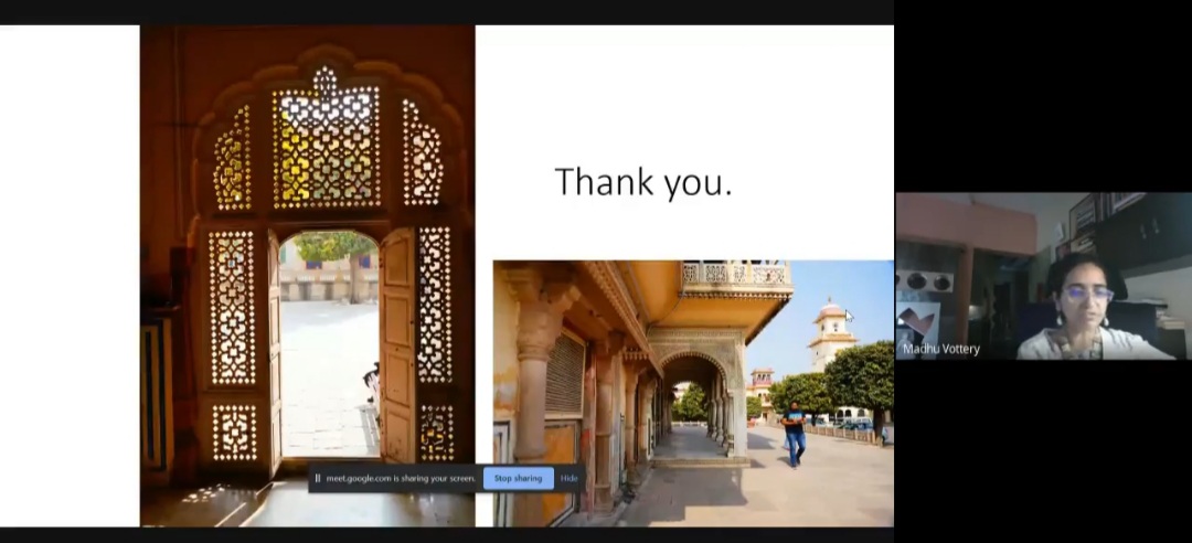 The Department of History with the support of IQAC, Loreto College Kolkata organized a virtual web-talk on 20 August 2020 between 3 and 4 p.m. The subject of the talk was ‘Indian Heritage and Cultural Tourism: Challenges with Focus on Telangana”. It was delivered by Ms Madhu Vottery, conservation architect and heritage professional. The talk was extremely lucid and provided a historical background of Telangana followed by the current challenges facing cultural tourism in the state. It was a visually rich presentation. Ms Vottery also showed an app which she has designed on Hyderabad and encouraged the students to download and explore it. All in all it was a learning experience for the department students of Semester 3 and Semester 5 who attended the session.