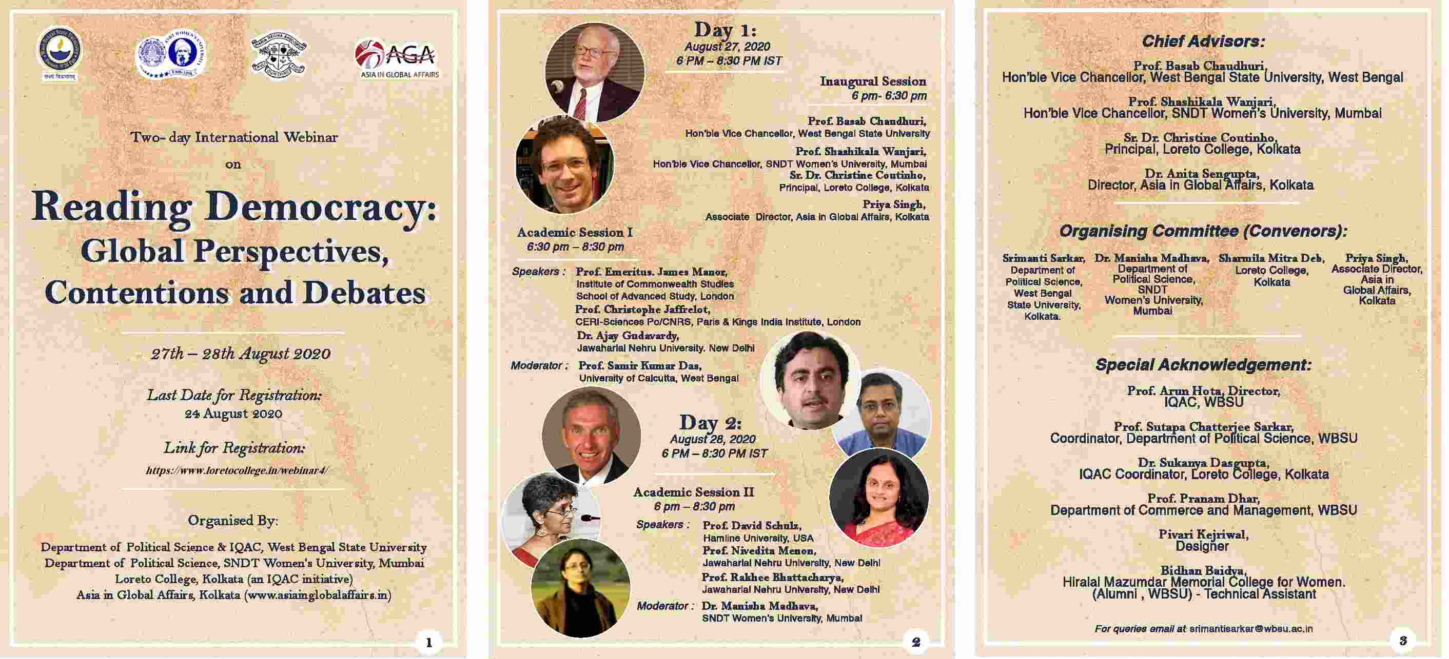 An International Webinar titled Reading Democracy: Global Perspectives, Contentions and Debates was held on 27 and 28 August, 2020. The webinar was jointly organized by the Department of Political Science and IQAC, West Bengal State University, the Department of Political Science, SNDT Womens University, Mumbai, IQAC, Loreto College, Kolkata, and Asia in Global Affairs, Kolkata.