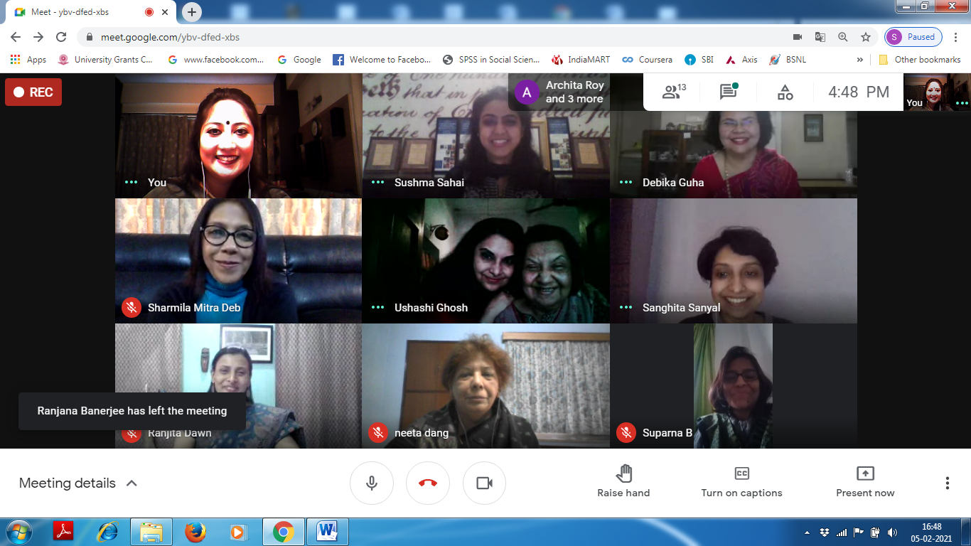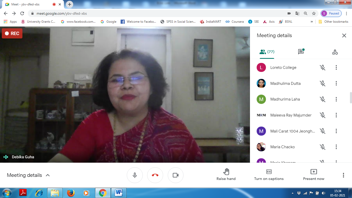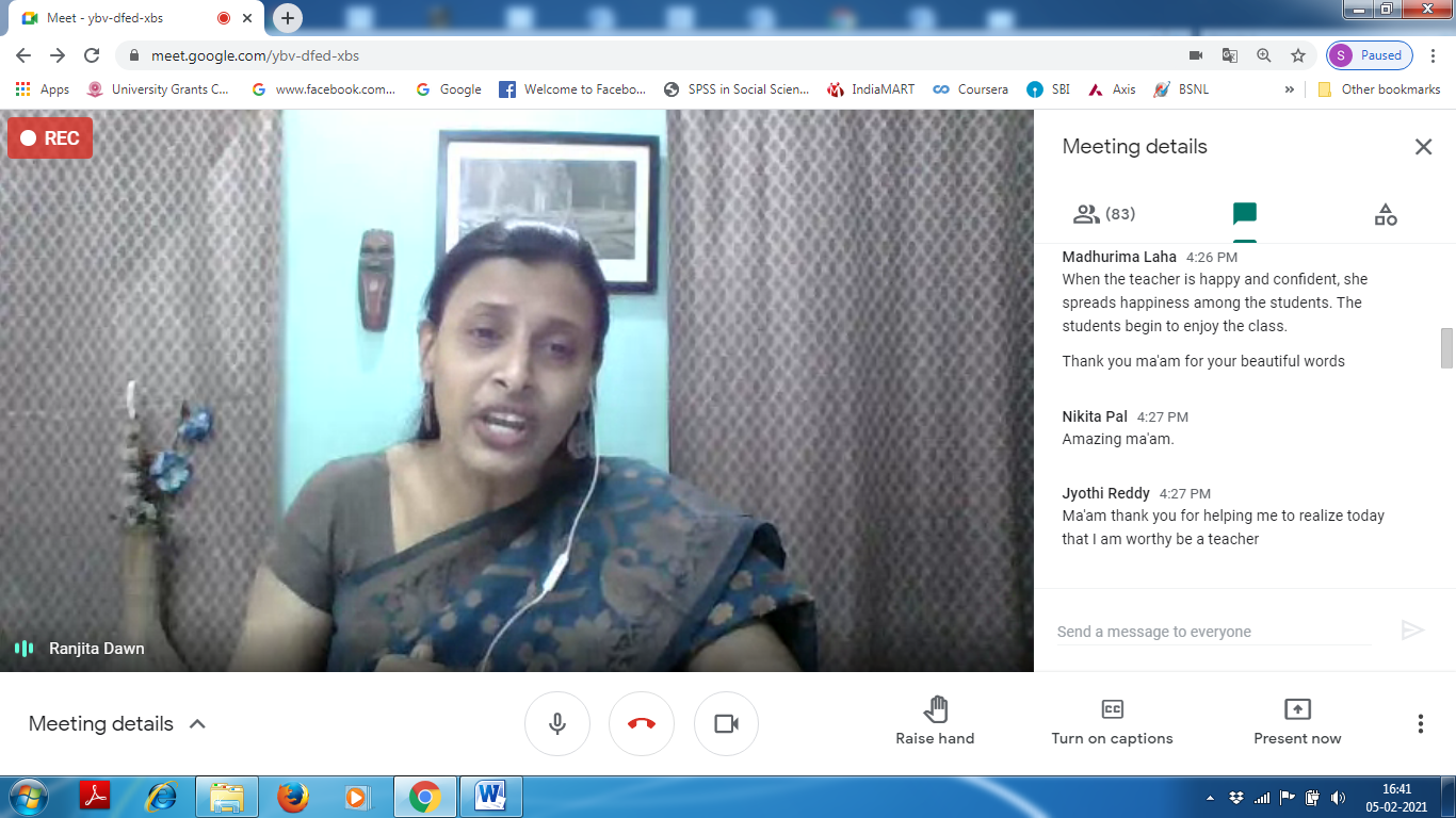 On February 05, 2021, The Department of B.Ed. Loreto College, Kolkata had organised a web talk (approved by IQAC) by Mrs. Ushashi Ghosh, faculty, The Heritage School, Kolkata and alumna of the Department of B.Ed. Loreto College. The theme of her talk was ‘The Happy Teacher’. The web-talk had begun from 3:30pm onwards on Google Meet. The programme began with a word of welcome by Sister Christine Coutinho, Principal Loreto College, Kolkata. It was followed by an introductory speech delivered by the Head of the Department of B.Ed, Dr. Debika Guha. Mrs. Ushashi Ghosh began her inspiring lecture with the help of a power-point presentation and by stating that in order to be a happy teacher, one must love the profession of teaching and be passionate about the job. Being chosen for such a profession and to do justice to it one must choose to be happy. The profession sometimes become monotonous due to repeated teaching of the same course material year after year and the initial motivation and happiness that a teacher enjoys may fade away with time. Thus a teacher needs to reinvent one self, find out newer techniques of teaching the same course material, innovate and find joy. This is because happiness is elusive and is therefore a never satiable goal. Mrs Ghosh further explained that happiness is inward, it is unachievable from any external source. Hence, a teacher must remember that happiness can be felt not only through performing simple day to day activities but also by having self-confidence, positive feelings and faith in oneself and sometimes by nurturing simple hobbies like reading, cooking, listening to music, playing and travelling. It can also be realised by helping someone and even through meditation. She asserted that a teacher must allot sometime in a day, or in a week in some self-satisfying activity to refresh, motivate and boost oneself. Each one of us have that capacity to figure out one at least one such activity that makes us happy and we must engage ourselves to be happy to make others happy. Students can identify a happy and a confident teacher and hence happily follows the teacher and it makes a classroom ideal one.