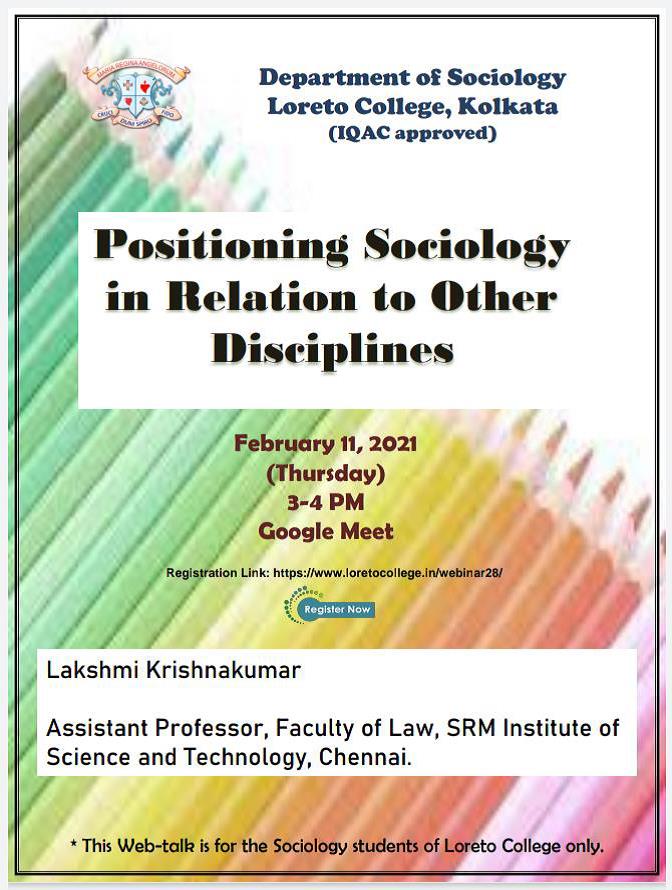 On February 11, 2021 (Thursday) between 3-4pm, the second Sociology Web-talk, organized by the Department of Sociology, and approved by IQAC, Loreto College was held. On this occasion our invited speaker was Ms. Lakshmi Krishnakumar, who is an Assistant Professor at School of Law, SRM Institute of Science and Technology, Chennai. She teaches Sociology, Legal History and Human Resource Management. She has completed her Bachelors and Masters in Sociology, and holds an M.Phil. in Sociology from Jawaharlal Nehru University, New Delhi with specialization in Medical Anthropology. Her interests span Sociology of Health and Medicine, Medical Anthropology, Literature, and Art History.