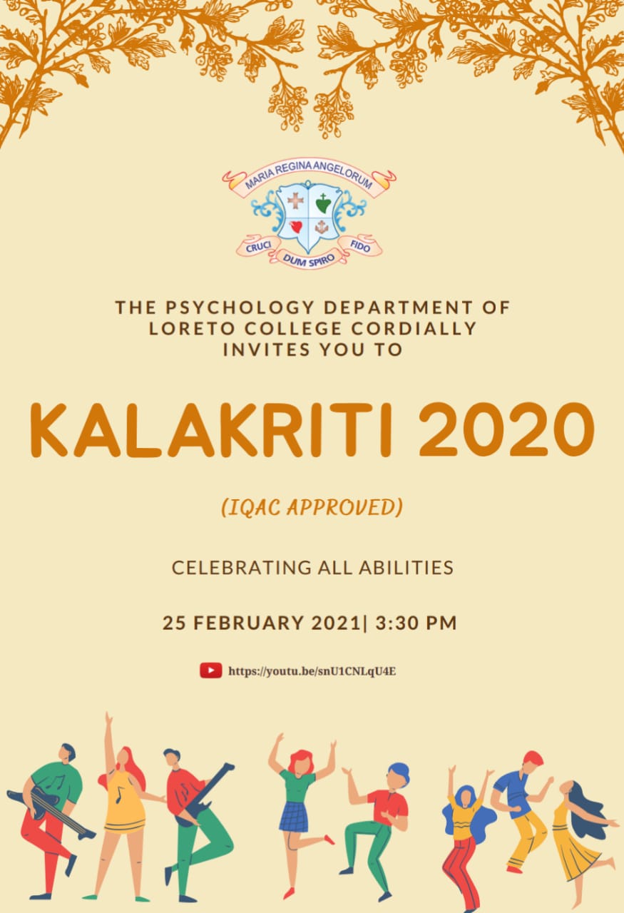 The Psychology Society of Loreto College organized its annual event Kalakriti - A Celebration of All Abilities, on the virtual platform YouTube in the form of a video premiere on 25th February, 2021 from 3:30 pm. This year’s Kalakriti was different but the enthusiasm and the brilliance of the performances of the students across a spectrum of abilities were no less. Students from Akshar, Behala Bodhayan, Indian Institute of Cerebral Palsy, Manovikas Kendra, Mentaid, Reach and Sarva Shiksha Mission participated in the four events of this year’s Kalakriti - Waste to Wealth, Dress as You Like, Solo Song with a Twist and Solo Dance. The event was judged by Mrs Papia Mukherji (Senior Librarian, Loreto College), Dr. Ranjana Banerjee (Associate Professor, Dept. of Education, Loreto College) and Ms. Ranjana Das (Counselor, Loreto College). The society is grateful to Sister Christine Coutinho, Ms. Sharmila Mitra Deb (AAO), Dr. Sushma Sahai (IQAC coordinator), staff advisors Dr. Dinaz R. Jeejeebhoy, Dr. Jhelum Podder and Dr. Saoni Banerjee, department teachers Dr. Sayantani Chatterjee and Mrs. Shankhabela Mukherjee, the judges, Ms. Donna Chung the students of the Dept. of Psychology and all the participating schools for their immense support in making this event a success despite the pandemic situation.