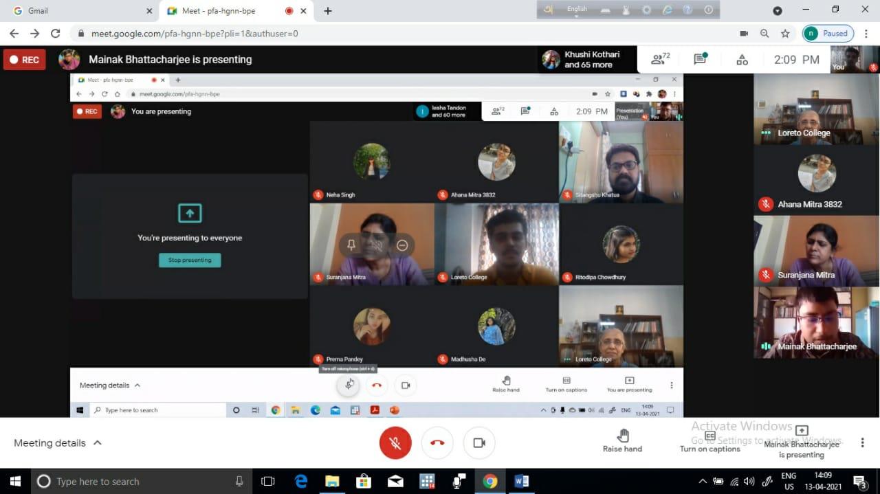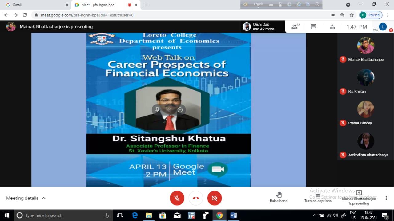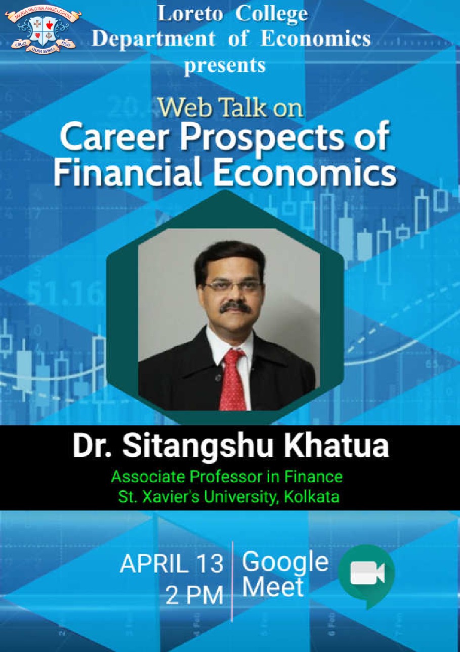 A Web Talk titled 'Career Prospects of Financial Economics' was organized by the Department of Economics for the students of the department on April 13, 2021. The resource person of the Web Talk was Dr. Sitanshu Khatua, Associate Professor of St. Xavier's University, Kolkata. The introductory speech was delivered by Mr. Mainak Bhattacharya followed by Sr. Dr. Christine Coutinho's welcome address. The main objective of the Web Talk was to enlighten the students on theoretical and empirical issues of Financial Economics and help students to identify the career prospects both in the academic as well as corporate field. Dr. Khatua initiated his discussion by throwing some light on the opportunities available in the field of Financial Economics and then discussed some theoretical aspects of Financial Economics citing some real-life examples. The lecture was very informative, insightful and enriching. Dr. Khatua interacted with the students throughout his lecture through interactive questions and responses which inspired the students and there was active participation by the students. The students were able to grasp the core concepts of Financial Economics and developed ideas about the varied range of professional courses that one can pursue after graduation in this field. This was an eye-opener for the faculty members as well. The session ended with a very effective question-answer session. The vote of thanks was proposed by Dr. Suranjana Mitra.