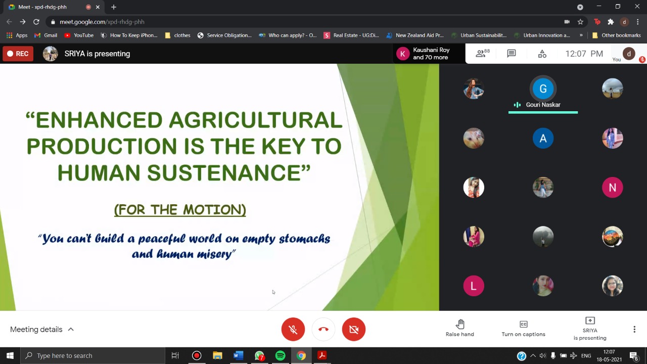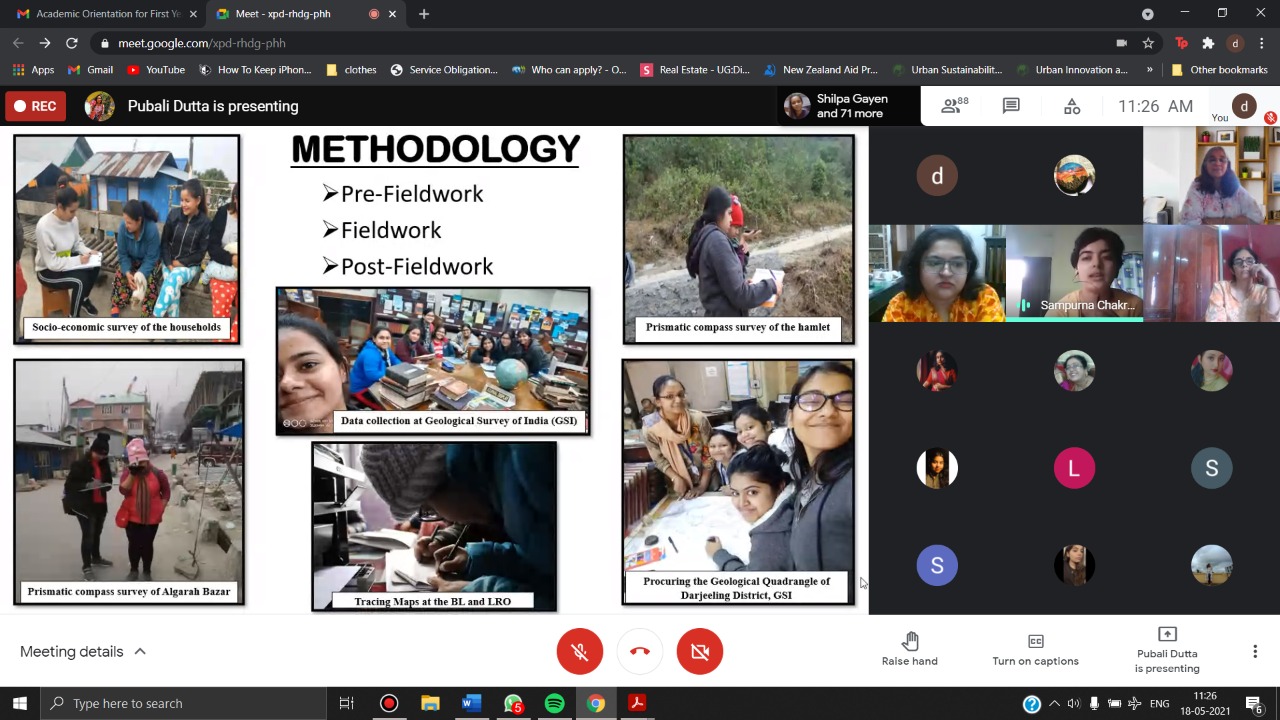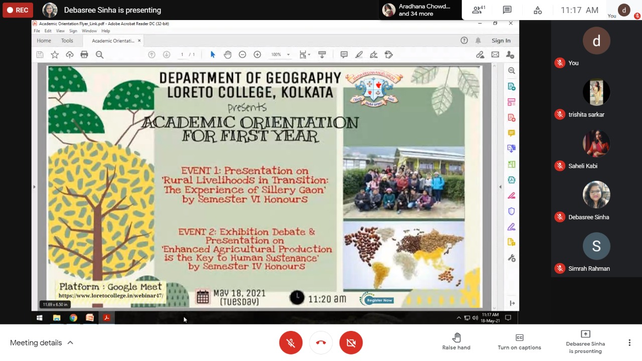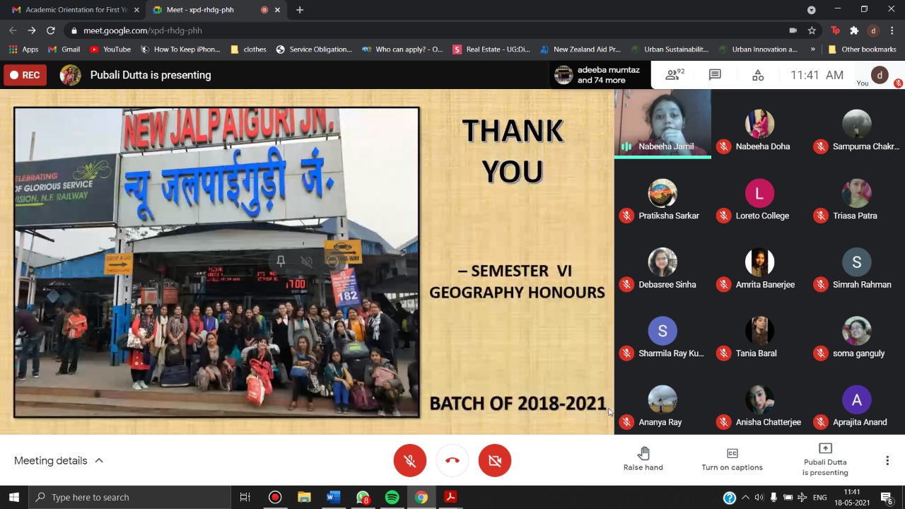 Every year the Department of Geography organizes an Academic Orientation for First Year students. Upholding this tradition, the Academic Orientation was organized in the virtual mode on May 18, 2021 on Google Meet. This was an attempt by the senior students of Semesters VI and IV to conduct an event that would help students of First Year to get more accustomed to the functioning of the Department. This year, the programme bore special significance considering the fact that the First Year students have been totally deprived of the opportunity of knowing their teachers and friends face-to-face, within the familiar surroundings of their College. Semester VI Honours presented the findings of their field visit to Kalimpong District in February 2020 under the title, Rural Livelihoods in Transition: The Experience of Sillery Gaon. The field study was a part of the evaluation of the practical course of Semester V Honours. Semester IV Honours debated on the motion Enhanced Agricultural Production is the Key to Human Sustenance.