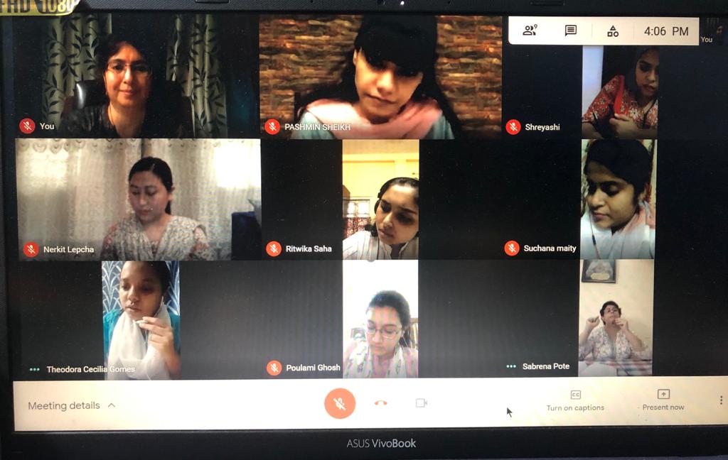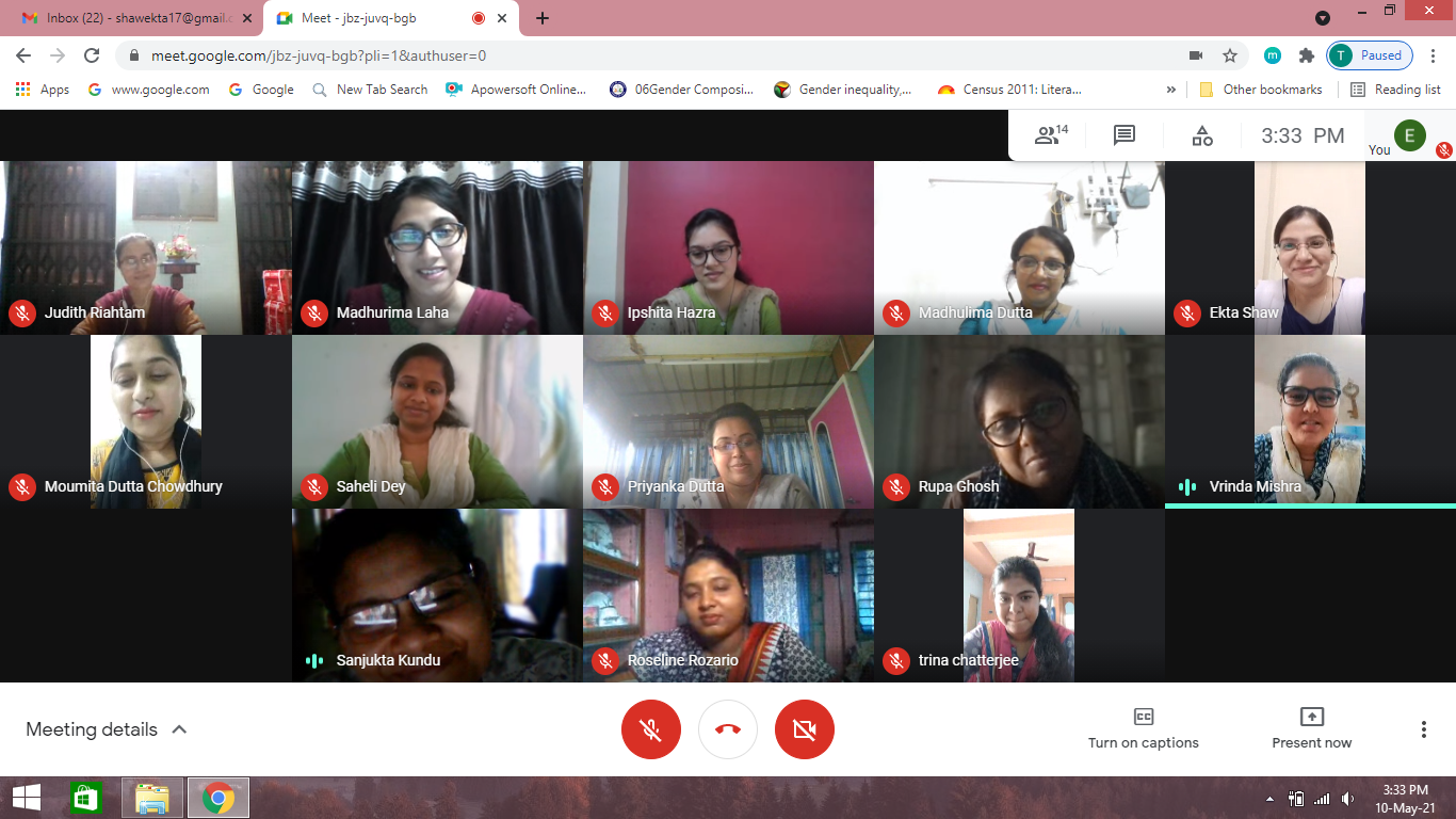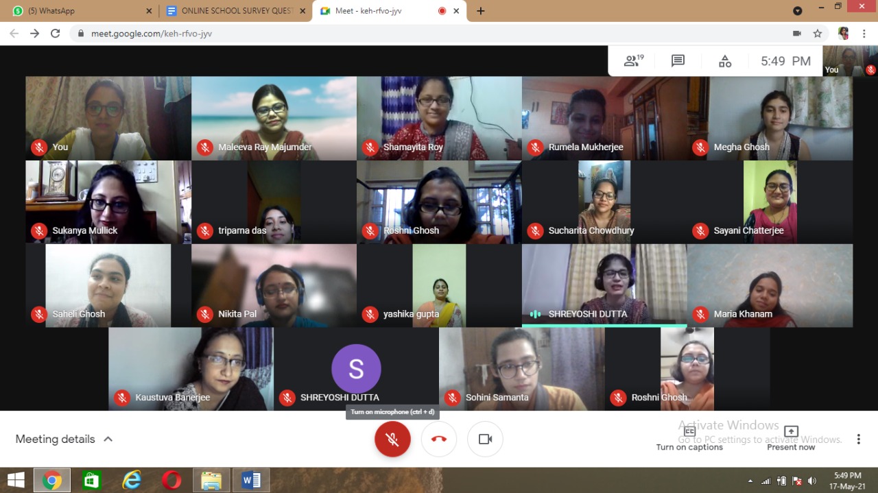 The 43 trainees of Semester IV of the Department of B.Ed. conducted online school surveys on four schools as part of the B.Ed. course Practicum. It was a first of its kind due to the Pandemic situation. The school surveys were conducted on Google Meet platform in the following schools - Our Lady Queen of The Missions School, Salt Lake, Loreto Day School, Dharamtala, St. Paul’s Boarding and Day School and Loreto Day School, Sealdah on May 10, 11 and 17, 2021 respectively. The B.Ed. trainees were enriched with knowledge of the mission, vision of the schools, along with details of academic orientation, infrastructural facilities, time-table details, teacher-student ratio, library facilities, co-curricular activities and student self- government. Through the survey the B.Ed. trainees appreciated the opportunities provided by each school for remedial and enrichment teaching-learning, special achievements of the schools and innovative practices followed by them to enrich the lives of the young students. Understanding the practical issues faced by school students during the Pandemic situation and the measures the schools have adopted to help the children to cope with the present challenging times has been a learning experience for the future teachers. We are deeply grateful to all school Principals - Sr. Sherly Sebastian, Mrs. Meenakshi Kapur, Sr. Rosli Kerketta and Ms. Margaret King for their permission and support to conduct the online school survey in these difficult times. We are very grateful to the teachers of each school- Ms. Sanjukta Kundu, Ms. Debjani Mahajan, Ms. Sabrena Pote and Ms. Roshni Ghosh for providing detailed information of their schools and for their patience and cooperation. The online school surveys were a unique learning experience for the students of the Department of B.Ed.