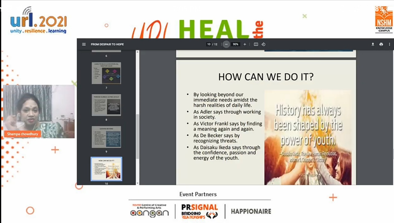 NSHM School of Media and Communication and NSHM Centre for Creative and Performing Arts (Aangan) presented Heal the World on May 21, 2021. At these difficult times due to the pandemic, it is essential to keep our spirits high. Heal the World was an attempt to infuse among the audience an air of positivity and to make us believe that we shall overcome. Loreto College being an academic collaborator of NSHM took an active part in this event. Hymns on Love, Faith and Hope by Loreto Sisters Annet, Ablin, Lily, Manjula, Priyanka, Adrina and Ms Sharon on the guitar set the mood for the evening. This was followed by a message on the present scenario by Mr Sumit Agarwal, founder of PR Signal. A soulful song by Ishanee Chatterjee, a student of Loreto College, enthralled the audience. There were several performances by students from NSHM each celebrating the spirit of life. Ms Sampa Chowdhury, a mental wellbeing associate, discussed ways to ward off the depression of quarantined life and lockdown. Ms Parama Gupta, Assistant Professor of Clinical Psychology at NSHM Knowledge Campus also shared her ideas about mental wellbeing. Yogesh Chabria, bestselling author, entrepreneur and founder of Happionaire shared positive messages about life. It was an evening that exhumed a lot of positive vibes!