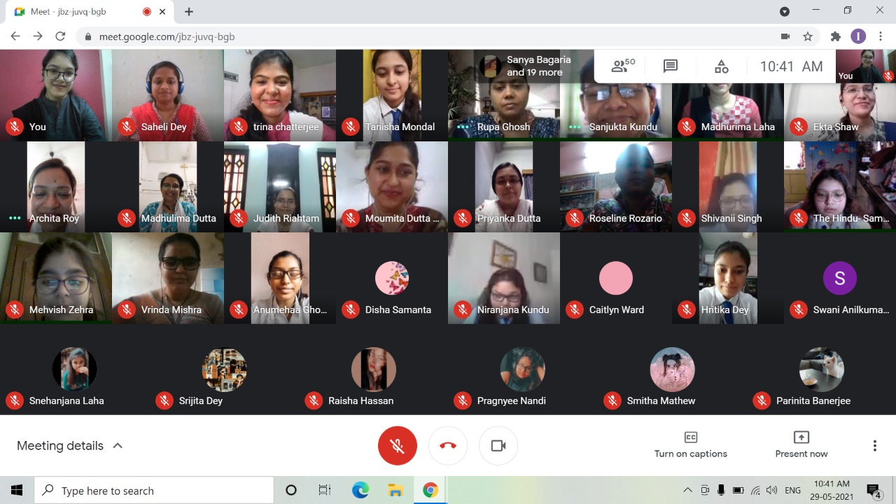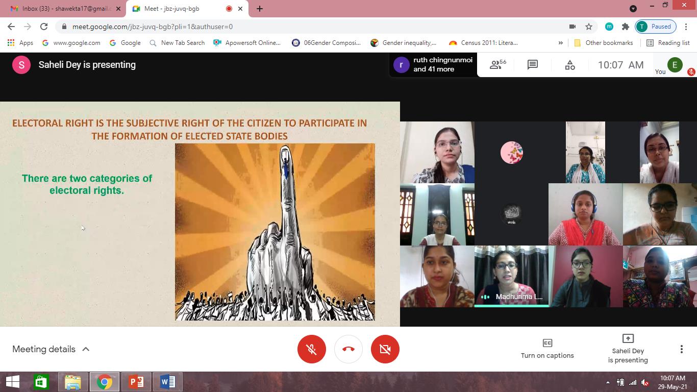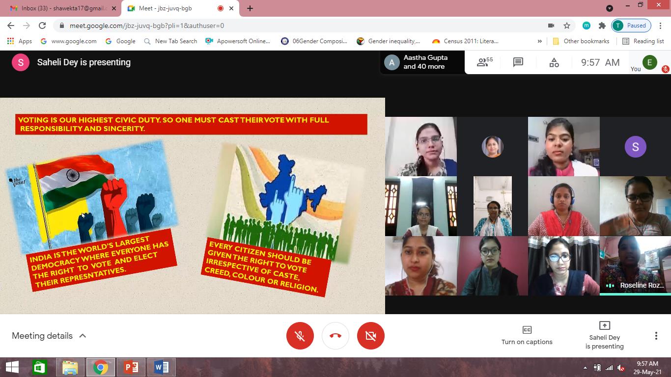 The Department of B.Ed, Loreto College, Kolkata in collaboration with Our Lady Queen of the Missions School, Salt Lake, Kolkata organised a virtual social awareness campaign on 'Awareness of Electoral Rights' for the students of class XI of the school. The campaign was conducted by B.Ed. trainees over Google meet on 29th May 2021. The programme began with a prayer service conducted by the school. After the prayer service the teacher trainees of the Department of B.Ed, Loreto College, addressed the students on the legacy of democracy in our country and various aspects of the Indian electoral process. The campaign focused on the positive aspects of the voting system, the malpractices, fundamental rights and duties of citizens of India and an awareness of electoral rights. An extremely fruitful interactive session followed between the B.Ed. trainees and the school students. We are grateful to the school Principal Sr. Sherly for her support and Ms. Sanjukta Kundu for her cooperation and her help.