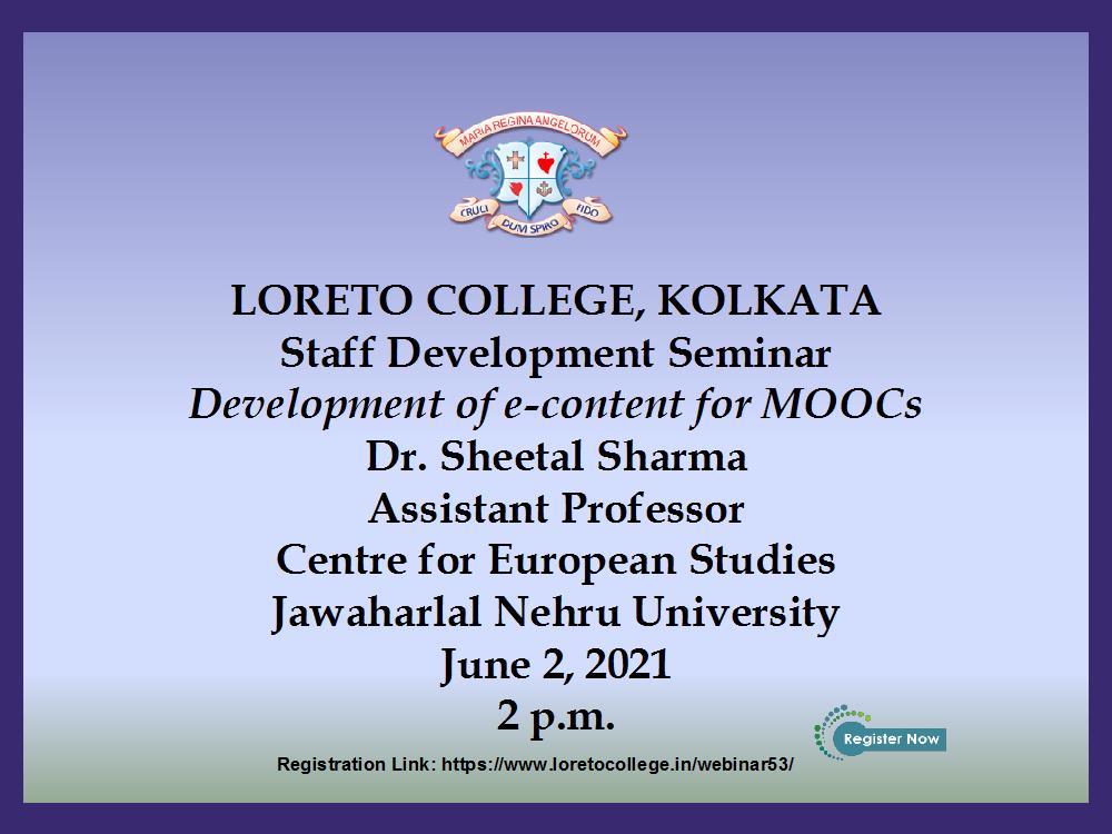 As a part of a series of Staff Development Webinars a demonstrative lecture on Development of E-Content for MOOCs was organized on June 1, 2021. The session was conducted by Dr. Sheetal Sharma, Assistant Professor, Centre for European Studies, Jawaharlal Nehru University, New Delhi. It was a thorough demonstration on how to prepare and launch an e-content on any subject on the Swayam platform and Dr. Sharma held a very thorough session discussing and demonstrating the ways of launching a complete course in a step-by-step manner. Her effective method helped our faculty to grasp the ways easily. Dr. Sharma’s articulation and engaging deliberation also shed light on the various issues involved in the process of video lecture and the ways of doing it easily. The members of the faculty came up with thought-provoking questions and interaction that followed, was also very interesting.