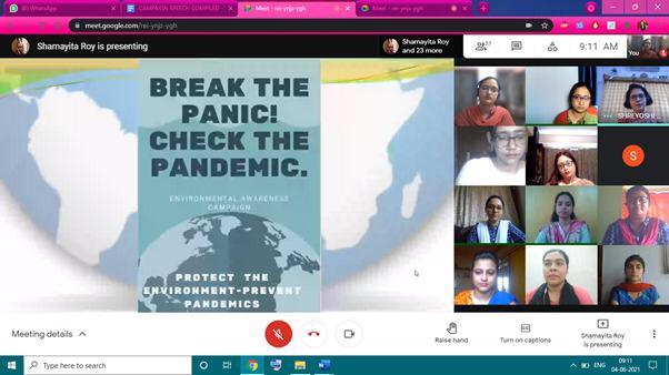 The Department of B.Ed., Loreto College, Kolkata, in collaboration with Loreto Day School, Sealdah, organised a virtual Environmental Awareness Campaign on the theme 'Protect the Environment - Prevent Pandemics' for the students of Class X of the school. The virtual campaign was conducted by the B.Ed. trainees on Google Meet on June 4, 2021. The session began with the teacher trainees of the Department of B.Ed. Loreto College, Kolkata, addressing the students, with a famous quote by Walt Whitman, on the importance of human role in the prevention of diseases and death. The campaign then proceeded with an illustrated discussion on the idea of pandemics, the history of various pandemics throughout the world in different timeframes and how humans have overcome each of these. The session was made even more effective for the school students with the help of a short relatable video on the need for preserving nature. The discussion was further carried on with a graphical representation of the emergence of new viruses all over the world and the failure of preventive measures taken for various pandemics. The need for establishing global solidarity in order to cope with the impact of pandemics was also discussed. An engaging activity was conducted with active and spontaneous participation of the school students through which, the importance of environmental conservation was established. The session ended with an illustrative discussion on the significance of sustainable development in protecting the environment and the role of human beings in the prevention of future pandemics. Various measures that could be taken by the students themselves in this respect, were discussed. Finally, the teacher trainees collectively took a pledge with all the students to act responsibly and collectively towards a promising future. The campaign focused on making the students aware of the gravity of pandemics, the measures that can be taken to prevent pandemics, and the role of students as citizens of tomorrow, in being the harbingers of a better tomorrow. The campaign ended with vote of thanks delivered by a trainee teacher from the B.Ed. Department, Loreto College. We are grateful to the Principal of Loreto Day School, Sealdah Ms. Margaret King and Ms. Shimu Roy for their immense support and cooperation.