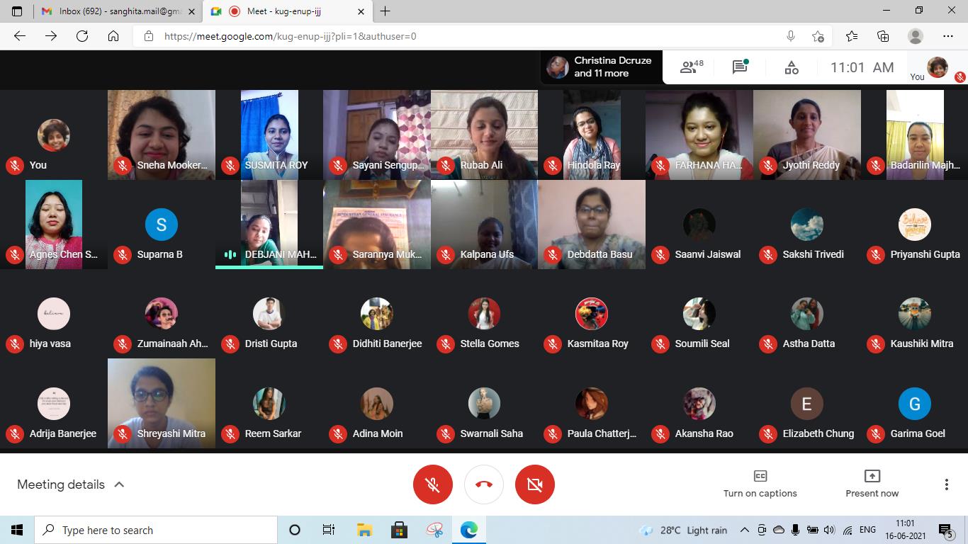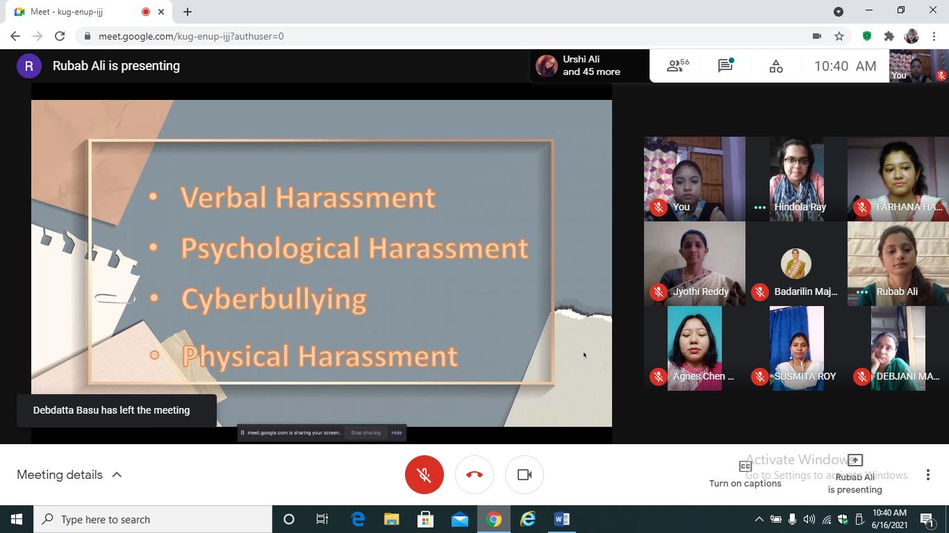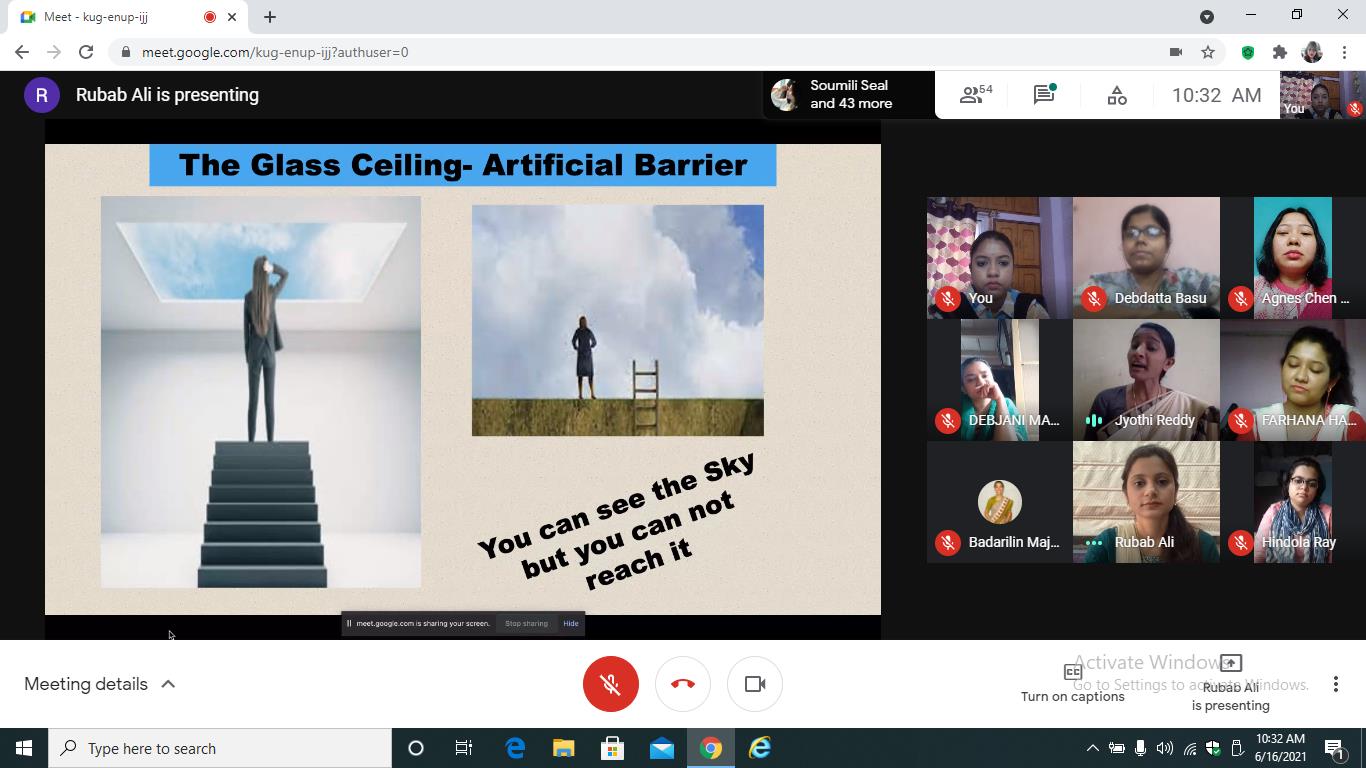 The Department of B.Ed., Loreto College, Kolkata, in collaboration with Loreto Day School, Dharamtala, organised a virtual social awareness campaign on 'Gender and Employment’ for the students of class IX of the school. The virtual campaign was conducted by the B.Ed. trainees on Google Meet on June 16, 2021. The session began with the teacher-trainees of the Department of B.Ed., Loreto College, Kolkata, addressing the teachers and students of the school and the screening of a video on a hypothetical situation of reversal of gender roles at the workplace to highlight the prejudices that women have to combat in their professional lives. The session continued with a detailed and illustrated discussion on the various problems women face in their field of work such as inferior treatment, the concepts of 'glass ceiling', de facto position of women, and the persistent issue of gender pay gap across different professional sectors. The school students were requested to participate in a Google poll session where three situations were presented to the students to gauge their opinion on certain issues. This was followed by a comprehensive discussion and portrayal of the types of harassment at the workplace which was complemented by a video on gender-based violence at the workplace. The teacher-trainees carried forward the session by suggesting some measures to overcome the gender-based problems in the professional field by shedding light upon significant matters such as grievance redressal system, proper work ethics, the various laws to protect women at workplace, the important Government schemes to help women with gainful employment and the roles played NGOs for making the professional space safe and free of prejudices for women. The discussions were concluded with an activity where the students put forth their views and thoughts about the campaign. The campaign focused on making the students aware of gender-based issues at the workplace and the measures to address and overcome them. The campaign was concluded by highlighting the powerful words of Mahatma Gandhi that “Woman is the companion of man, gifted with equal mental capacity” to reiterate the need for equality of gender at the workplace. The campaign ended with a vote of thanks delivered by a teacher-trainee from the Department of B.Ed., Loreto College. We are grateful to Mrs. Meenakshi Kapur, Principal, Loreto Day School, Dharamtala, and Ms. Debjani Mahajan for their immense support and cooperation towards this programme.