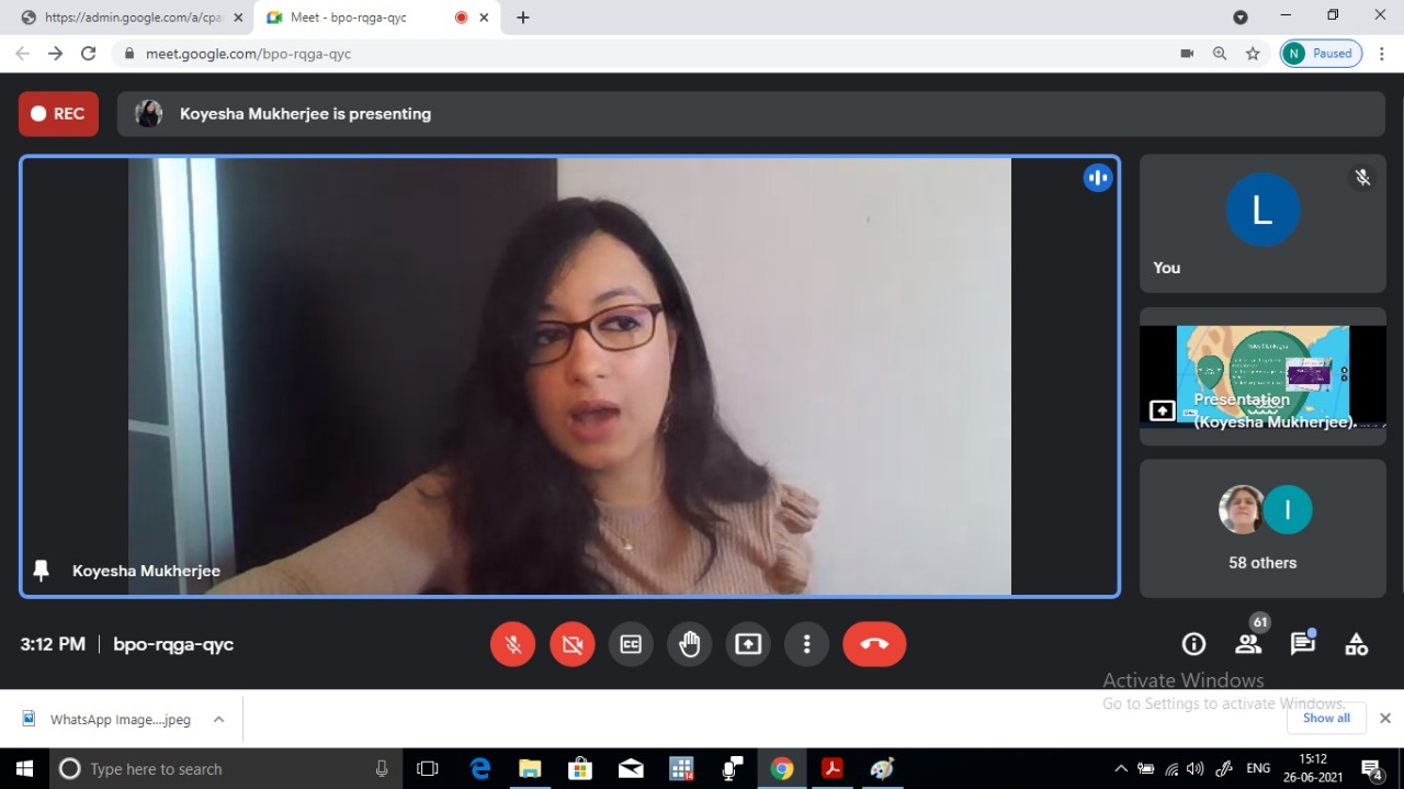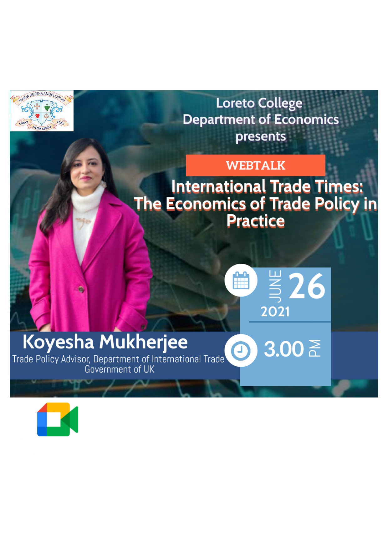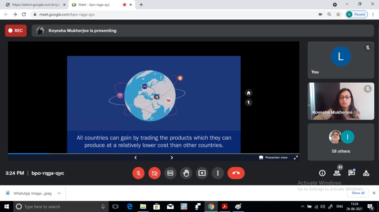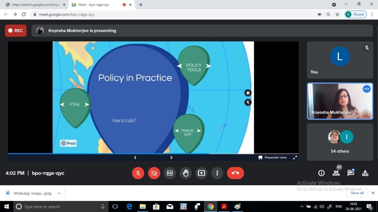 The Department of Economics organized a Web Talk titled International Trade Times: The Economics of Trade Policy in Practice on June 26, 2021. The speaker for the Web Talk was Ms. Koyesha Mukherjee, a past pupil of the department who is currently the Senior Trade Policy Advisor at the Department for International Trade, Government of United Kingdom. The session began with an introduction by Dr. Suranjana Mitra. The objective of the Web Talk was to enable students to understand the characteristics of modern trade, benefits and risk of trade, gain knowledge about various trade agreements and implications. The students were able to develop practical knowledge about trade negotiations and gather information about WTO Rules and political economy of trade policy. The lecture was very well organized with effective presentation through slides and videos. The lucid explanation and excellent presentation and delivery motivated students to lend their ears patiently. There was an interactive session arranged by the speaker in the form of a quiz in the middle of the session which added a new dimension to the Web Talk. The session was highly enriching, informative, insightful and engaging. The students and the faculty members actively participated during the question answer session. The session ended with a formal vote of thanks proposed by Dr. Rupa Ghosh.