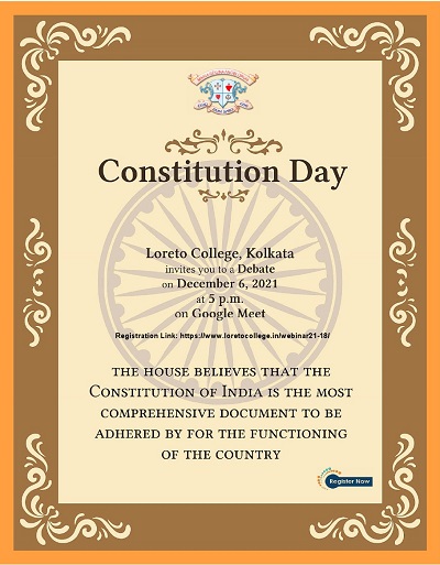 To commemorate Constitution Day 2021, the College organized an intra college debate on December 13, 2021. The debate was conducted over Google Meet. The motion before the house was The Constitution of India is the most comprehensive document to be adhered by for the functioning of the country. Two teams comprising three students each, argued eloquently giving the audience much to ponder upon. The winning team was side Opposition, Meghna Bhattacharya (1st year Political Science Honours), Tanushka Dutta (3rd year English Honours), Ashwriya Malik (3rd year English Honours). Ritansha Banerjee (3rd year Political Science Honours) and Meghna Bhattacharya were jointly declared Best Speaker and Aishwriya Malik was judged as the runner up. The judges were Dr Zaad Mehmood. Assistant Professor, Department Political Science, Presidency University, Mr Shekhar Niyogi, Editor and Consultant - Tourism, Education and Media and Mr Subrata Sarkar, former senior executive, SBI currently senior faculty of Bandhan School of Development Management.