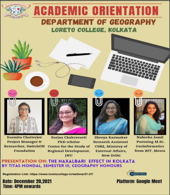 The Department of Geography, Loreto College organized an Academic Orientation for the students of the Department, especially the freshers on December 20, 2021. The orientation program consisted of two segments: the first was a research presentation by Titas Mondal (Semester III, Geography Honours); which was followed by an interactive session with former students of the department. The research presentation by Titas, was on The Naxalbari Effect in Kolkata. The study carried out under the guidance of Mrs. Ganguly, traced the Naxalite Movement in India, assessed its root causes, studied its impact on society and analysed the present scenario.