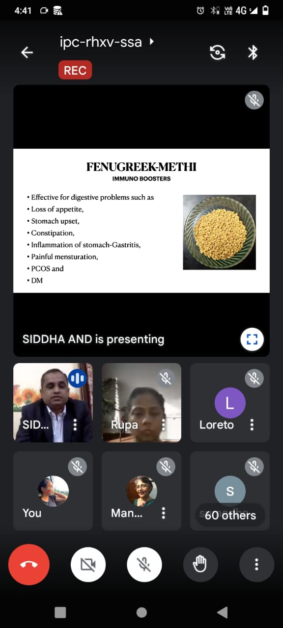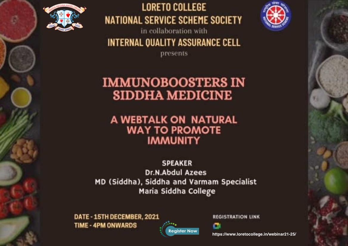 The National Service Scheme Society of Loreto College, Kolkata in collaboration with IQAC organized a web talk on Immunoboosters in Siddha Medicine to create awareness on natural ways to promote immunity on December 15, 2021. The platform was Google Meet. The resource person for the web talk was Dr N.Abdul Azees, MD (Siddha), Siddha and Varmam Specialist, Maria Siddha College, Coimbatore, Tamil Nadu. Dr Azees illuminated the audience with information on the Siddha medicine - a traditional system of healing that originated in South India and is considered to be one of India’s oldest systems of medicine. The first half of the talk provided insights about various aspects of a human body such as antibodies, antigens, immunity system, functions of the immunity system, immunity boosters, different types of immunity (Innate immunity, Passive immunity and Acquired immunity), organs responsible for developing a healthy immune system of an individual and ways to improve our immune system through a healthy diet, exercising, adequate sleep, etc. In the second half of the talk, the resource person shared his knowledge about kitchen ingredients like Cumin seeds, Turmeric, dry Ginger, Fenugreek, Cardamom, Black Pepper and Garlic, their medicinal properties and how to use these simple ingredients to cure diseases. Dr Azees also explained to the students the importance of micronutrients such as Iron, Magnesium, Zinc, Vitamin C and D, their recommended dosage and how these can be obtained easily. The web talk concluded with the Indian Philosophy of medicine, its history and background.