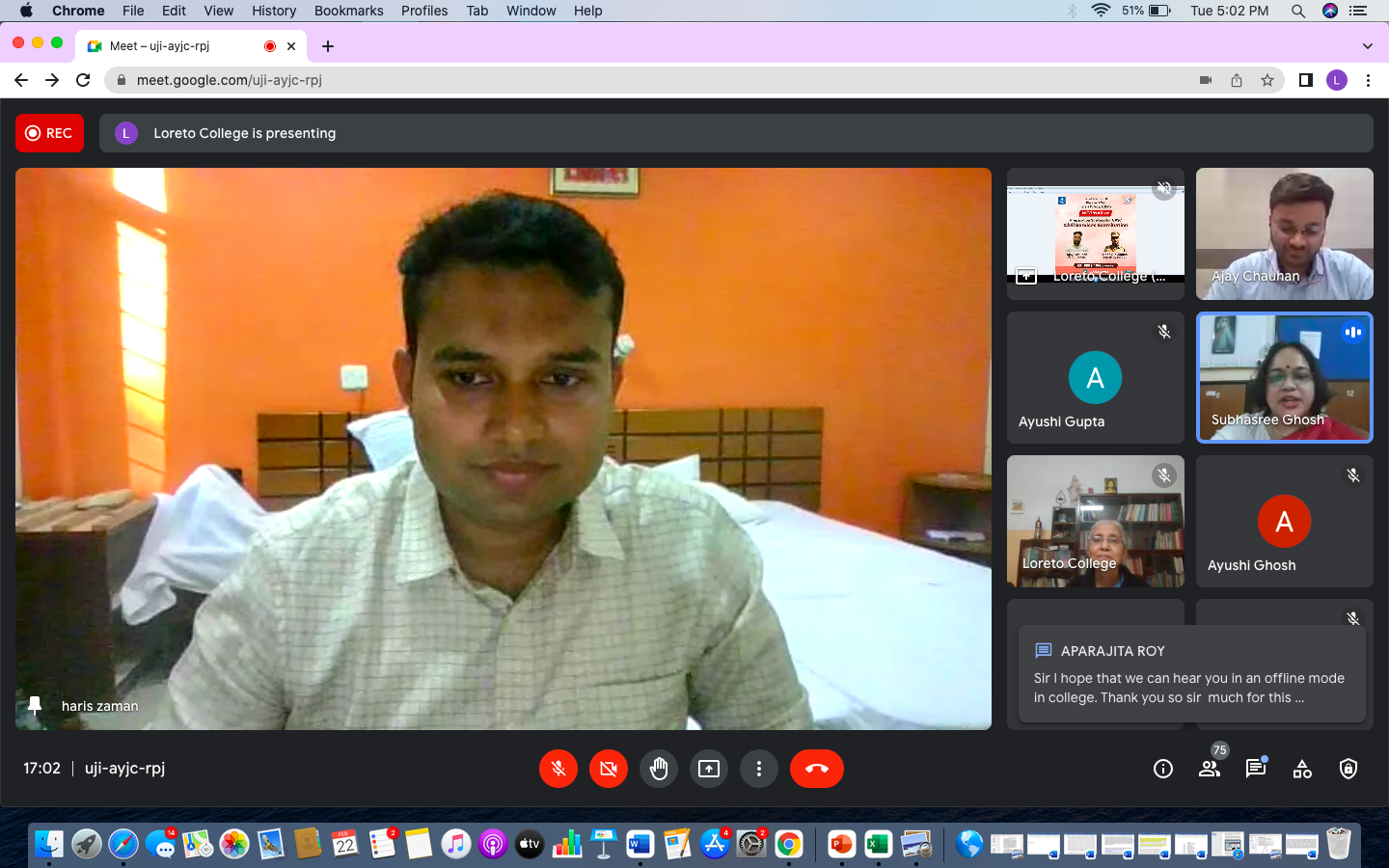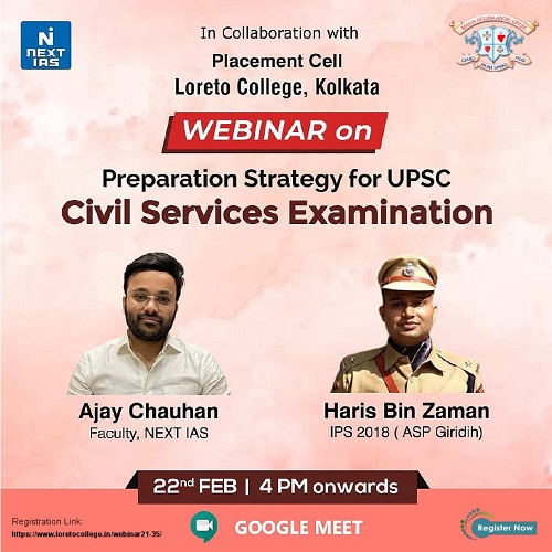 The Placement Cell of Loreto College in collaboration with Next IAS organised an online webinar on 'Preparation Strategy for UPSC Civil Services Examination' on February 22, 2022. The resource persons, Mr. Haris Bin Zaman, ASP, Giridih, Jharkhand and Mr. Ajay Chauhan, Faculty, Next IAS, shared their in-depth knowledge of the UPSC examinations and offered guidelines to the students to aid them prepare for civil services examinations. This was followed by an interactive session where students voiced their questions and concerns all of which were addressed insightfully by the resource persons. The session was attended by about 80 students as well as the Principal, Sr. Dr. Christine Coutinho; the Academic and Administrative Officer, Mrs. Sharmila Mitra Deb and the Placement Cell Officers of the college.