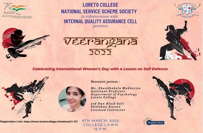 To celebrate International Women's Day on March 8, 2022 the NSS Society of Loreto College in collaboration with IQAC Cell organized a workshop on ‘Self-Defence' in the College premises. Ms. Shankhabela Mukherjee, 3rd Dan Shotokan Karate Black belt, Licensed Instructor and Assistant Professor in the department of Psychology of the college was the resource person of the program. A total of 40 students participated in the workshop.