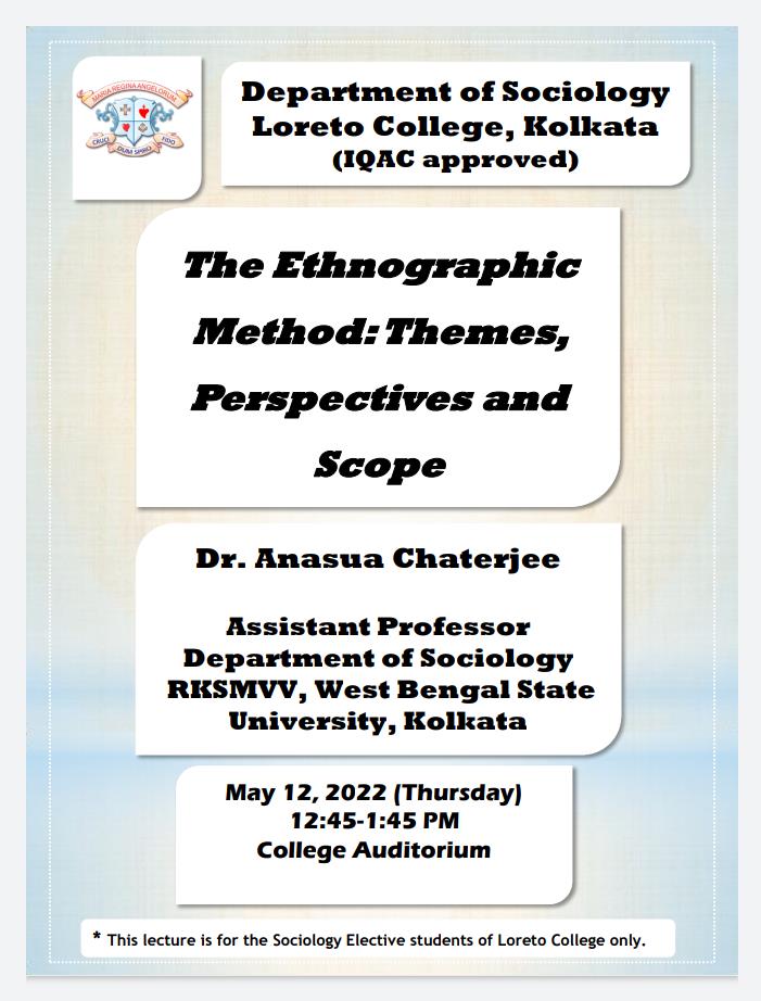 On May 12, 2022, a Sociology Special Lecture was organized by the Department of Sociology, and approved by IQAC, Loreto College. On this occasion our invited speaker was Dr. Anasua Chatterjee, who is an Assistant Professor of Sociology at RKSMVV, West Bengal State University, Kolkata. She works on urban spaces in contemporary India, focusing on diversity, socio-spatial dynamics and aspects of identity and belonging. Her recent publications include Margins of Citizenship: Muslim Experiences in Urban India(2017, Routledge) and “Negotiating a Better Life: Emerging Trends in the Politics of Ordinary and Poor Muslims in Kolkata” (2019, Journal of South Asian Development).