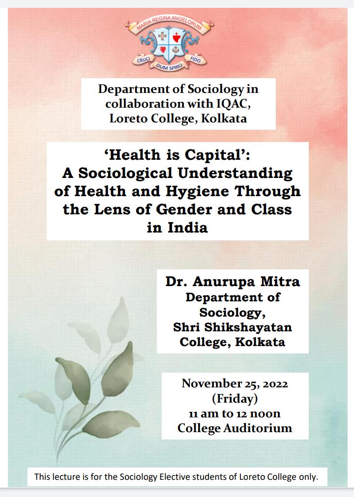 The Department of Sociology in collaboration with the IQAC, Loreto College organised a special lecture on November 25, 2022 for the Sociology General Elective students of Semesters 1 and 3. The resource person for this event was Dr. Anurupa Mitra, Department of Sociology, Shri Shikshayatan College, Kolkata. Her lecture, entitled “‘Health Is Capital’: A Sociological Understanding of Health and Hygiene through the Lens of Gender and Class in India,” elaborately explained how the concepts of health and hygiene are entangled with the categories of gender and class in the Indian context. Dr. Mitra delved into the cultural meanings of illness and then deliberated on the social construction of medical knowledge and the experience of illness. This was followed by a discussion on theoretical approaches to health. During the course of this lecture, various images were used to solicit preliminary responses from the students, which were then analysed by the speaker from a disciplinary standpoint. The discussions focused on how the consumption of certain ‘medical’ products available in the market innately bring out a new way of understanding health and hygiene, especially when viewed through the sociological lens of gender and class.
