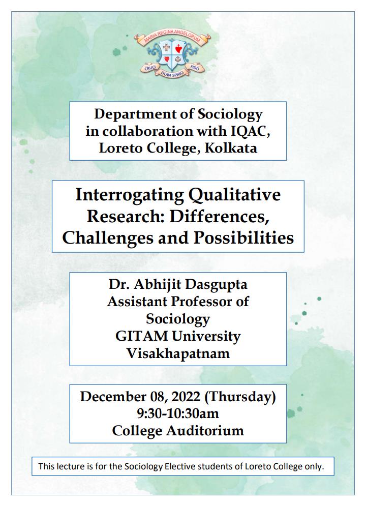 On December 8, 2022, the Department of Sociology in collaboration with the IQAC, Loreto College invited Dr. Abhijit Dasgupta, Assistant Professor of Sociology at GITAM University, Visakhapatnam to deliver a special lecture on “Interrogating Qualitative Research: Differences, Challenges and Possibilities.” The event was attended by the Sociology General Elective students of Semesters 1 and 3. Dr. Dasgupta’s lecture explored ‘how’ and ‘why’ qualitative methodology differs from its quantitative counterparts; and the meanings and motivations associated with qualitative research. Students were introduced to the nature, scope, and possibilities of qualitative research, with particular emphasis on the unique methods and challenges of the fieldworker. Dr. Dasgupta also highlighted the ways in which the knowledge of the twin disciplines of sociology and social anthropology can guide us in our understanding of social life and its multifarious complexities. The students attending the lecture responded keenly to the presentation and were encouraged to incorporate qualitative research and fieldwork in their future academic endeavours.
