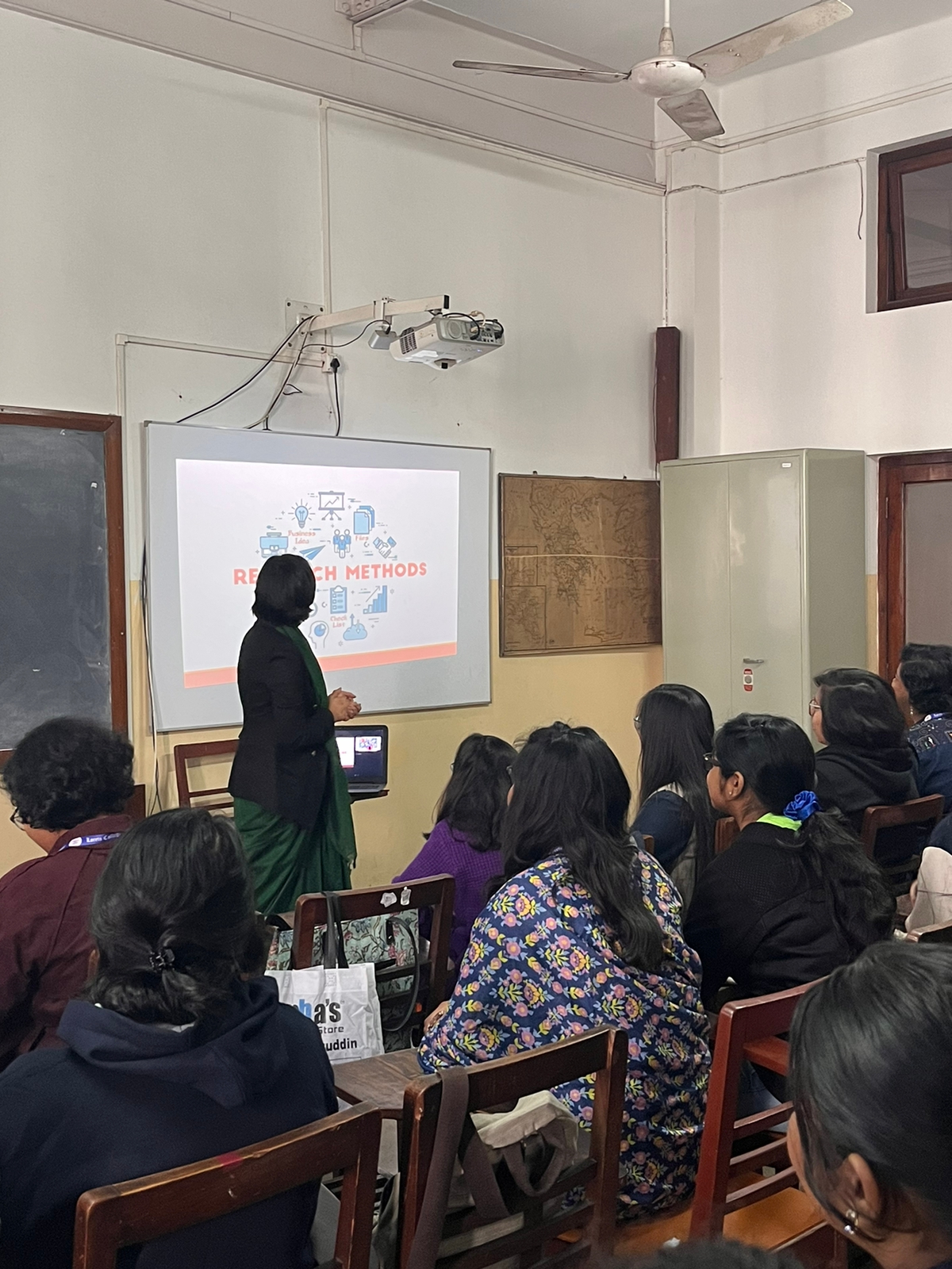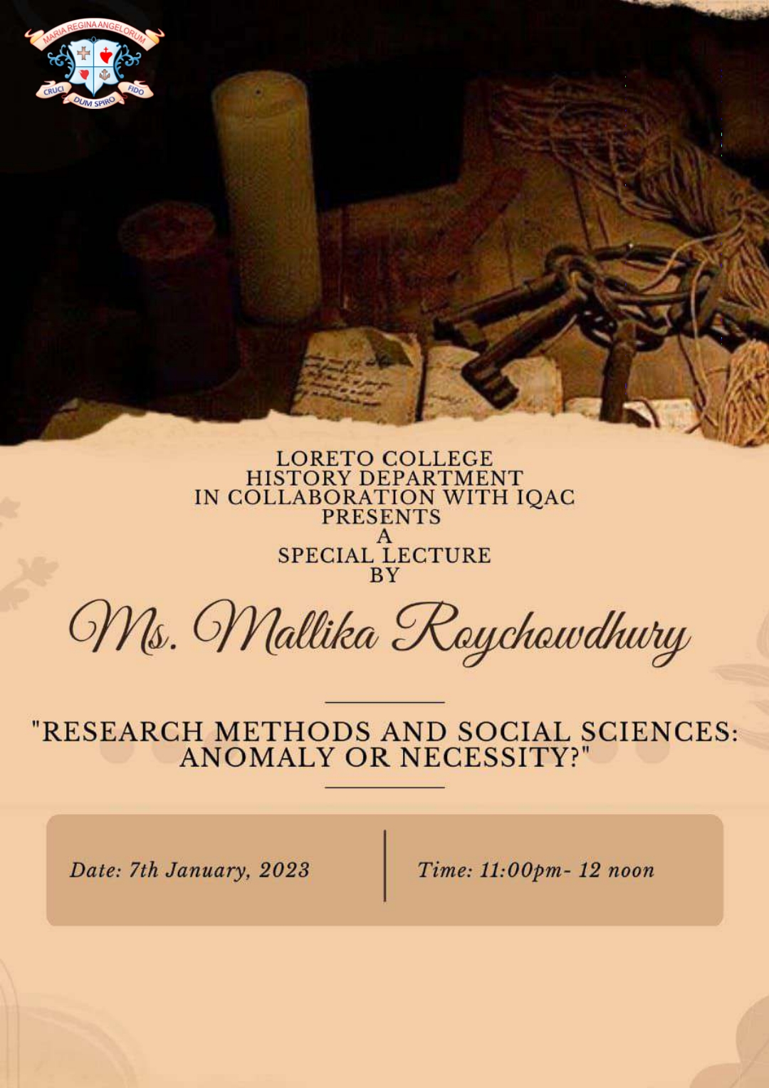 Ms. Mallika Roy Choudhury had been invited by the Department of History, to speak on Research Methodology on January 7, 2023. Her topic was Research Methods in Social Sciences: Anomaly or Necessity. The talk covered various concepts and issues with research methods. Through the course of the talk the need for rigour in the design, method and methodology of research was emphasized upon with various examples from history. Students were made to appreciate the differences that existed between qualitative and quantitative research methods, apart from being apprised of the varied sources and the importance of their judicious and ethical use in the reconstruction of the past in historical methods. Throughout her talk Ms. Roy Choudhury strongly advocated the necessity of historical methods in Social Sciences along with the need for interdisciplinary approaches to research in the Humanities.