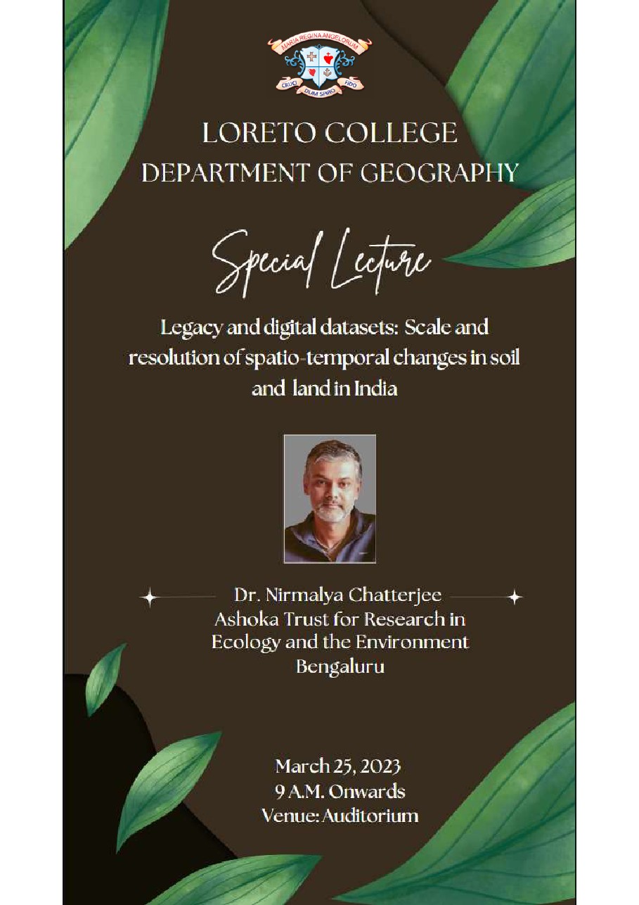 The Department of Geography, Loreto College organized a Special Lecture entitled “Legacy and Digital Datasets: Scale and Resolution of Spatio-temporal Changes in Soil and Land in India” on March 25, 2023. Dr. Nirmalya Chatterjee, Fellow, Ashoka Trust for Research in Ecology and Environment, Bengaluru was the resource person.