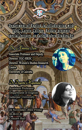 The Department of English in collaboration with the Internal Quality Assurance Cell (IQAC) of Loreto College organized two special lectures on Early Modern Studies on November 24, 2023. The resource persons were Dr. Amrita Sen, who is Associate Professor and Deputy Director, UGC-HRDC as well as Director, Women’s Studies Research Centre, University of Calcutta, and Dr. Doyeeta Majumdar, Assistant Professor, Department of English, Jadavpur University.