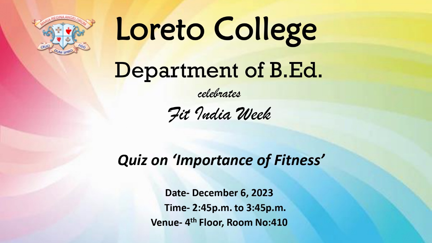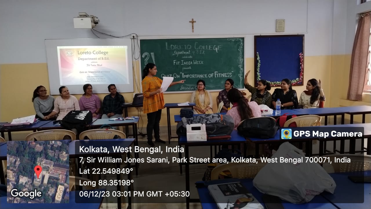 To celebrate Fit India Week, the Semester I trainees of the Department of B.Ed. at Loreto College, Kolkata organized a vibrant quiz on ‘Importance of Fitness’ on December 6, 2023. The B.Ed. trainees of Semester III actively participated in the quiz. They were divided into five groups named after prominent sportspersons. The quiz served as an engaging platform for the dissemination of knowledge about the significance of physical well-being. Team Mary Kom showcased their prowess and emerged victorious, adding a competitive spirit to the celebration and reinforcing the commitment to a healthy lifestyle.